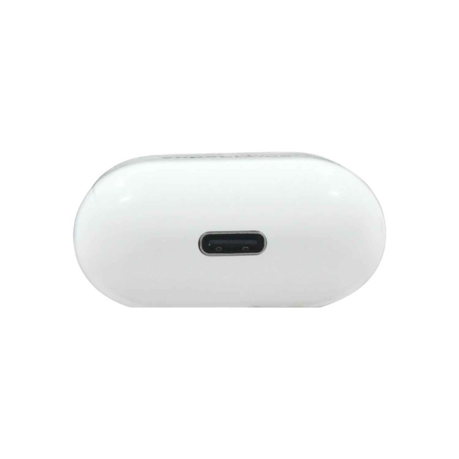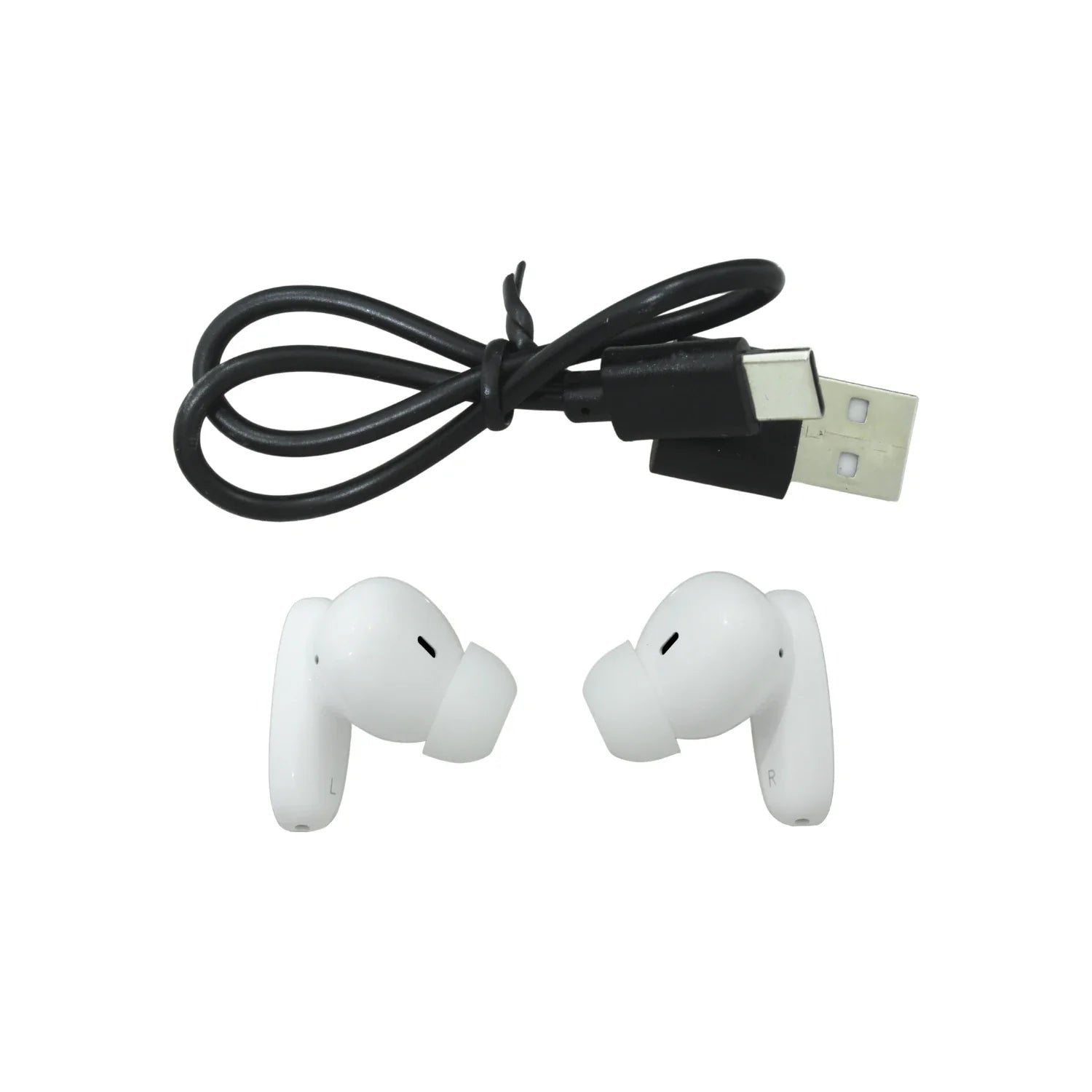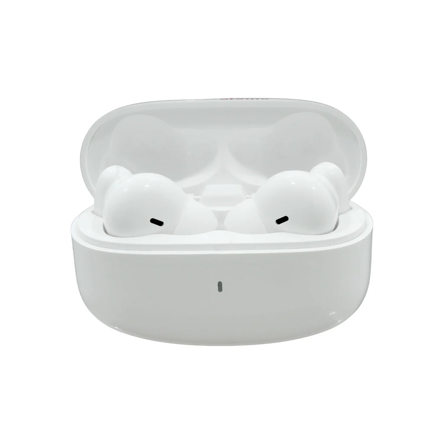 Audífonos inalámbricos con estuche de plástico blanco, ofrecen un sonido nítido, conexión estable y batería duradera para disfrutar tu música sin cables. Compatible con cualquier dispositivo