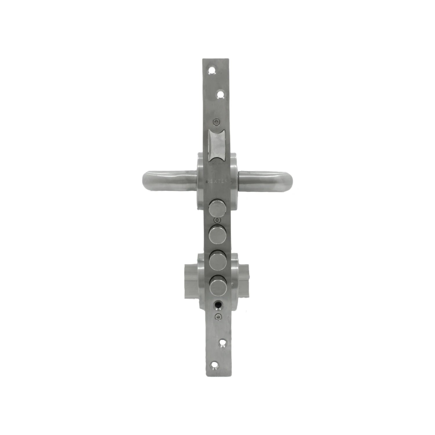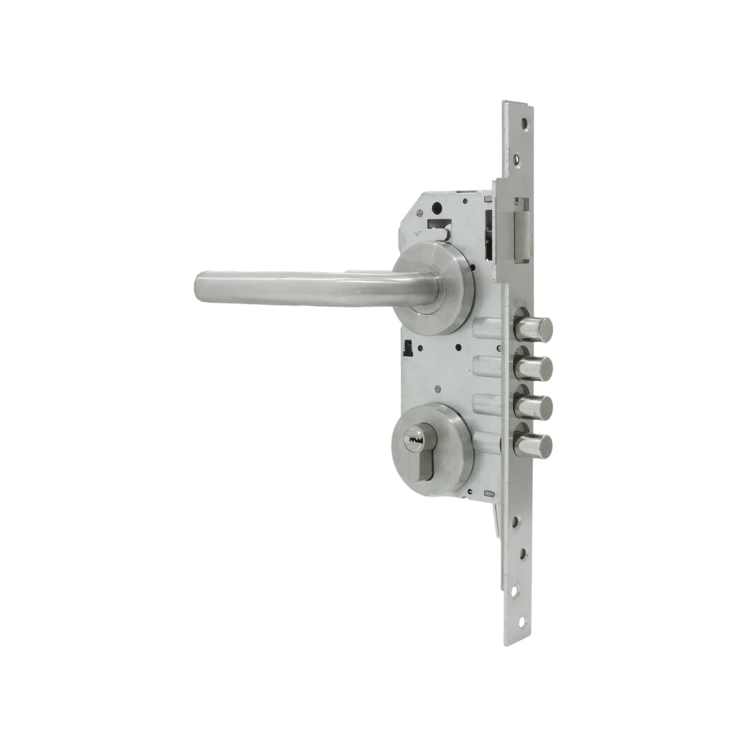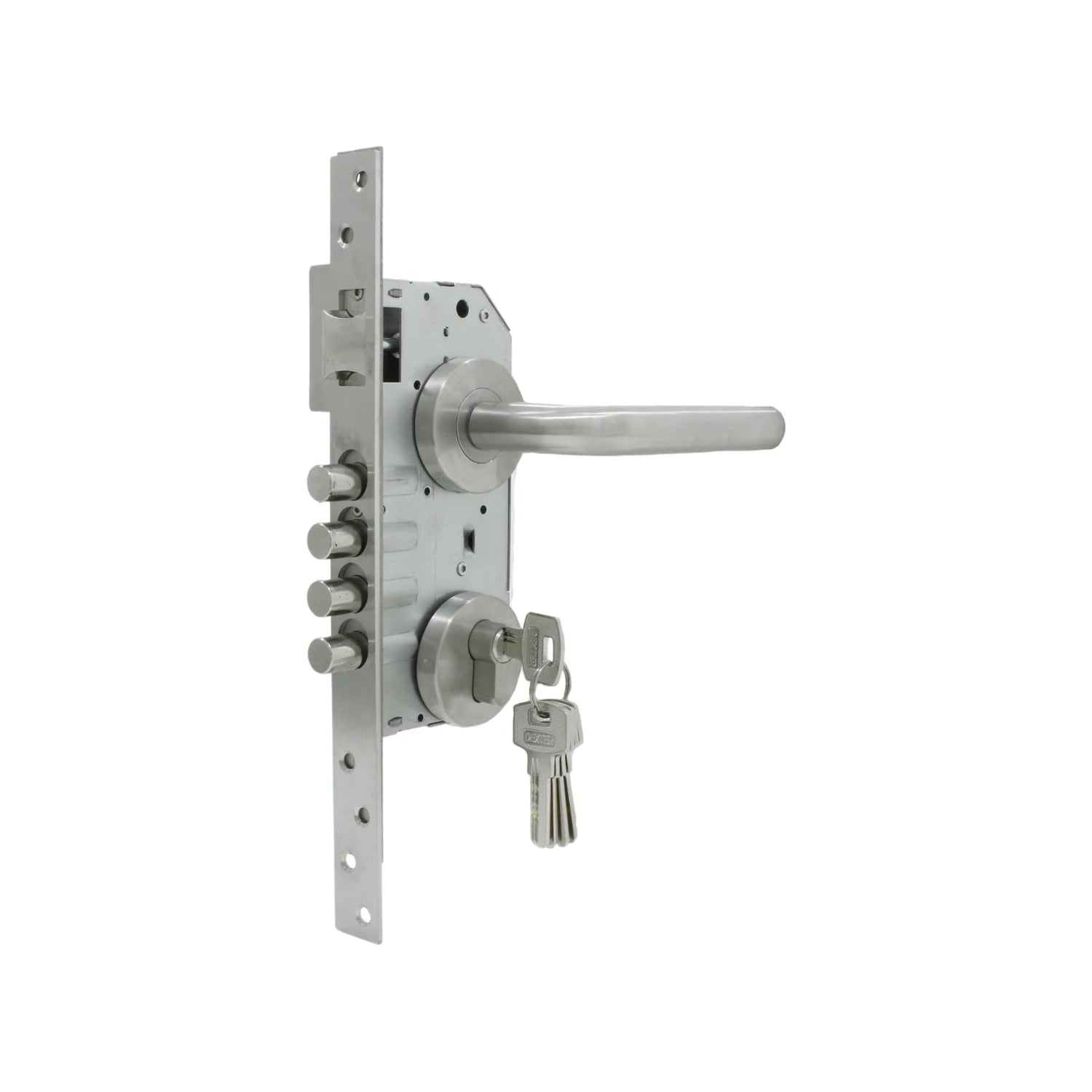 - Cerradura con mecanismo de embutir de 2 pasos, con pestillo y 4 bulones.