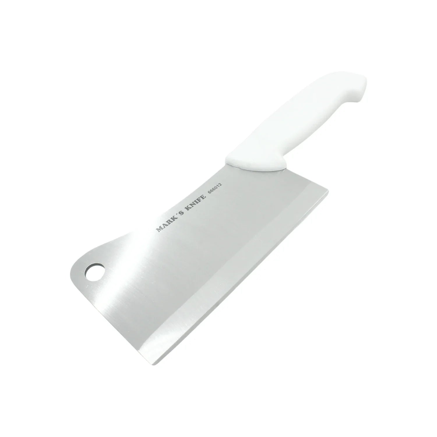 El cuchillo cleaver profesional Mark's Knife de 6" está diseñado para cortes exigentes en cocina. Su hoja ancha de acero inoxidable templado y mango de polipropileno ofrecen potencia, precisión y durabilidad.