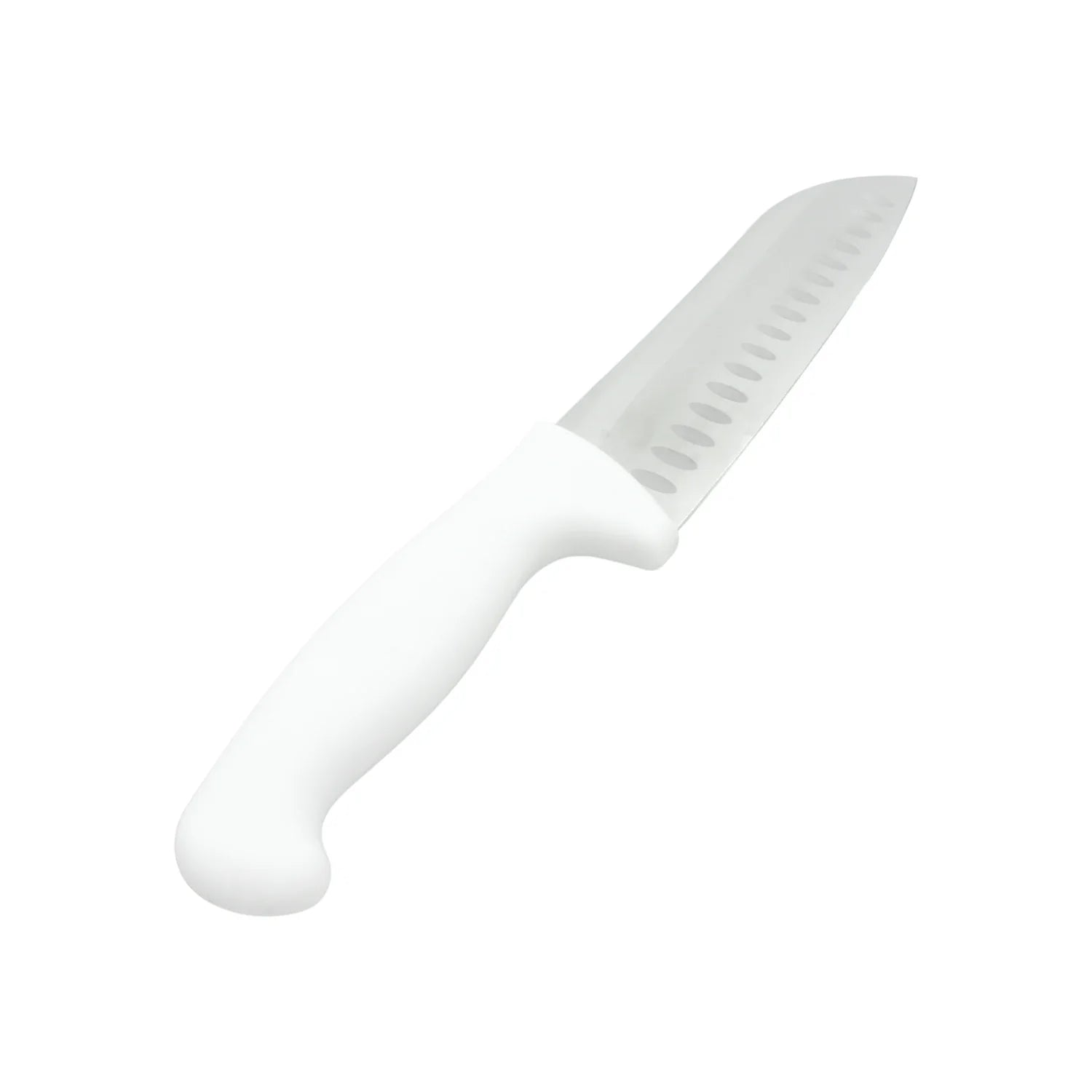 El cuchillo Santoku profesional Mark's Knife de 7" está diseñado para cortes rápidos y precisos. Su hoja troquelada de acero inoxidable templado y mango blanco de polipropileno ofrecen higiene, comodidad y eficiencia en cocina profesional.