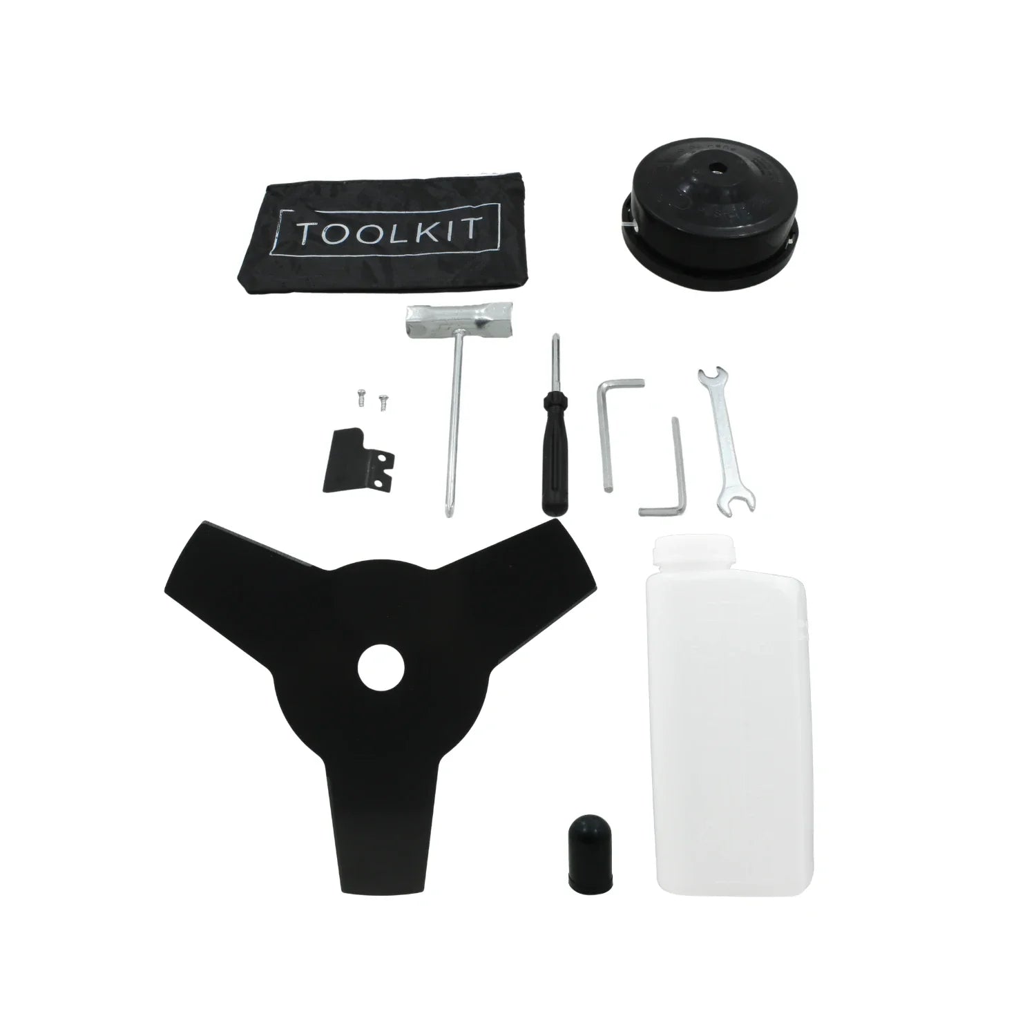 Incluye: Motor, cabezal, porta hilo, cuchilla desbrozadora, par de empuñadura, protector, arnés, llave combinada