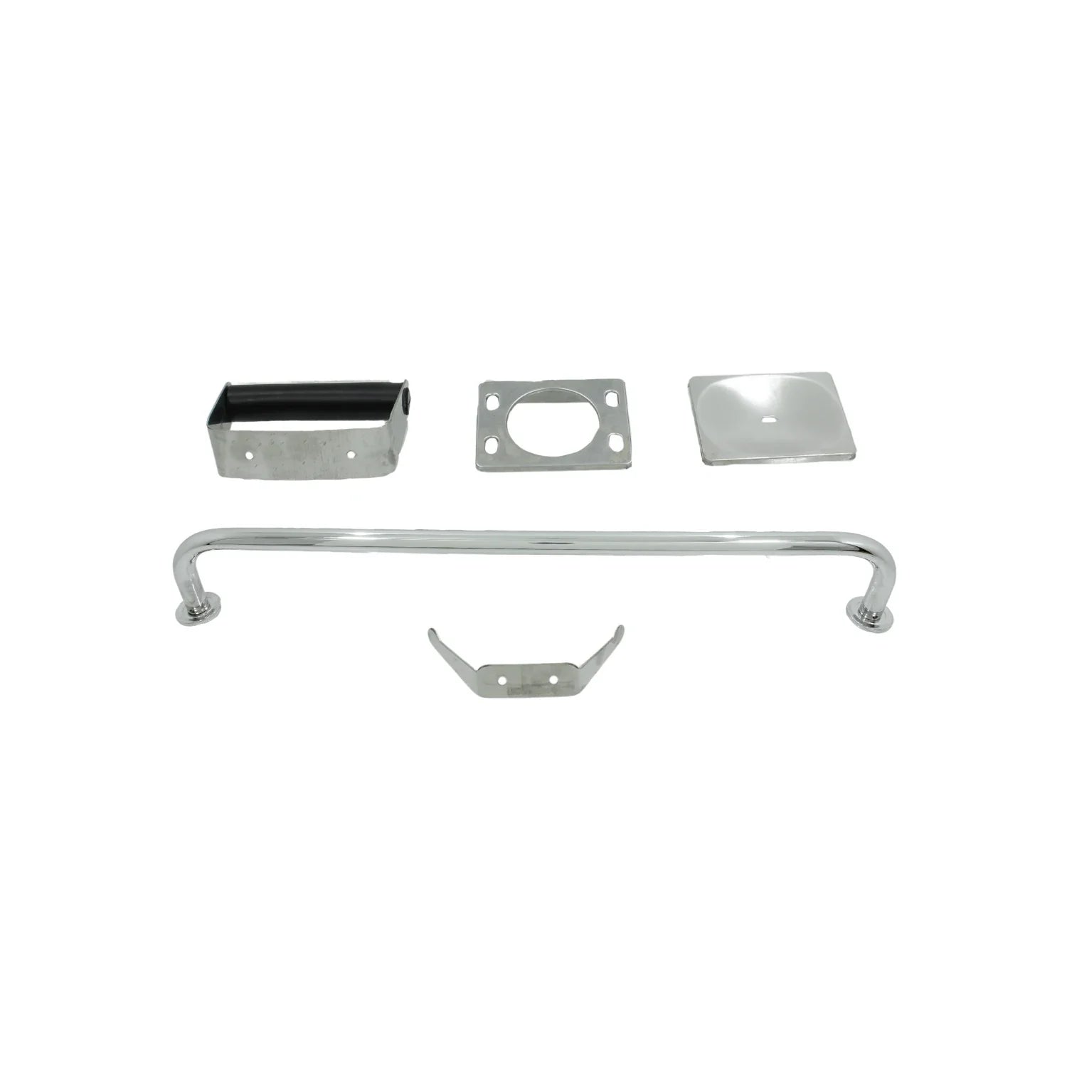 Juego de accesorios para baño cromado Metalflu 07652 con diseño moderno y funcional, ideal para complementar la decoración de tu baño, incluye elementos esenciales como barra para toalla de mano, soporte para papel higiénico, porta vasos, jabonera y toallero de gancho, fabricados en acero inoxidable con acabado cromado para mayor durabilidad y resistencia a la corrosión.