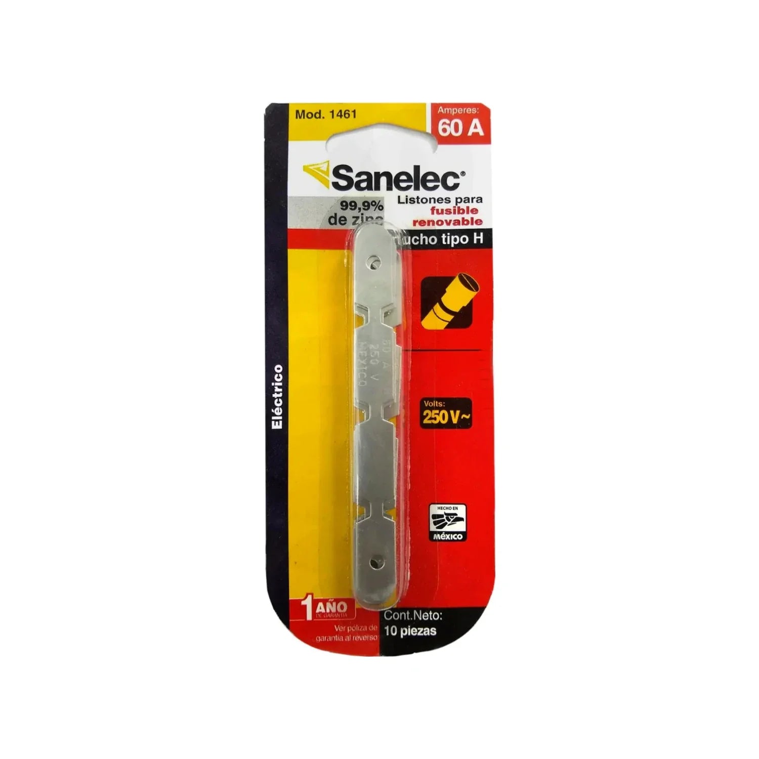 Listón de repuesto Sanelec 1461 para fusibles renovables tipo H. Fabricado en zinc de alta pureza (99.9 %), diseñado para soportar hasta 60 amperios de corriente en instalaciones domésticas, comerciales o industriales. Compatible con cartuchos estándar.