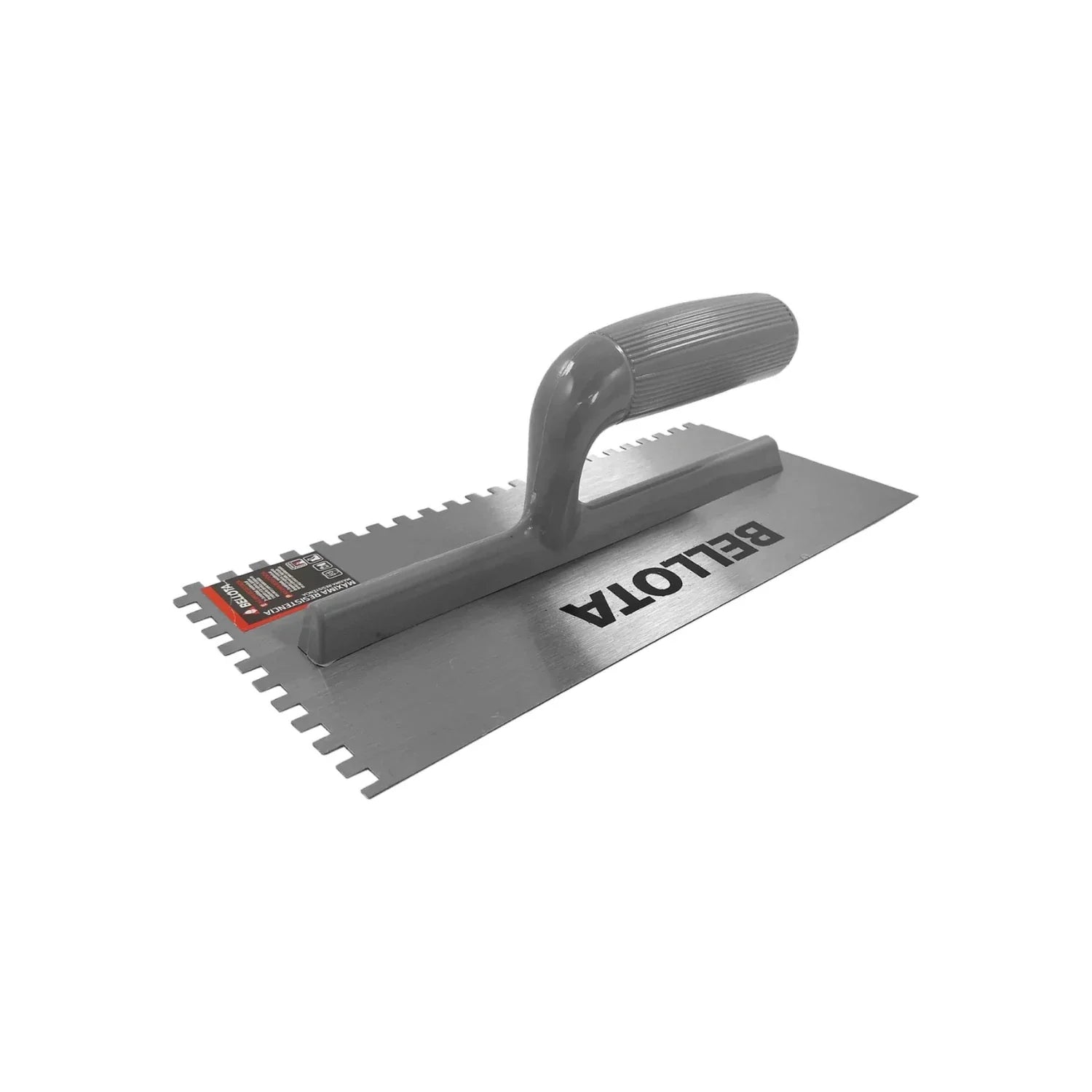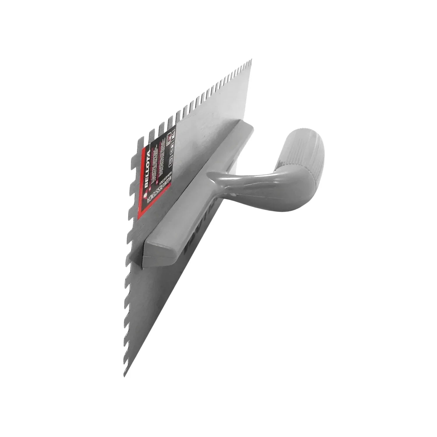 Llana dentada Bellota 750877 con hoja de acero inoxidable y mango ergonómico de polipropileno. Dentado cuadrado de 1/4" (6 mm), ideal para aplicación de adhesivos en cerámica, azulejo y porcelanato. Diseño ambidiestro, ligera y resistente a la oxidación.