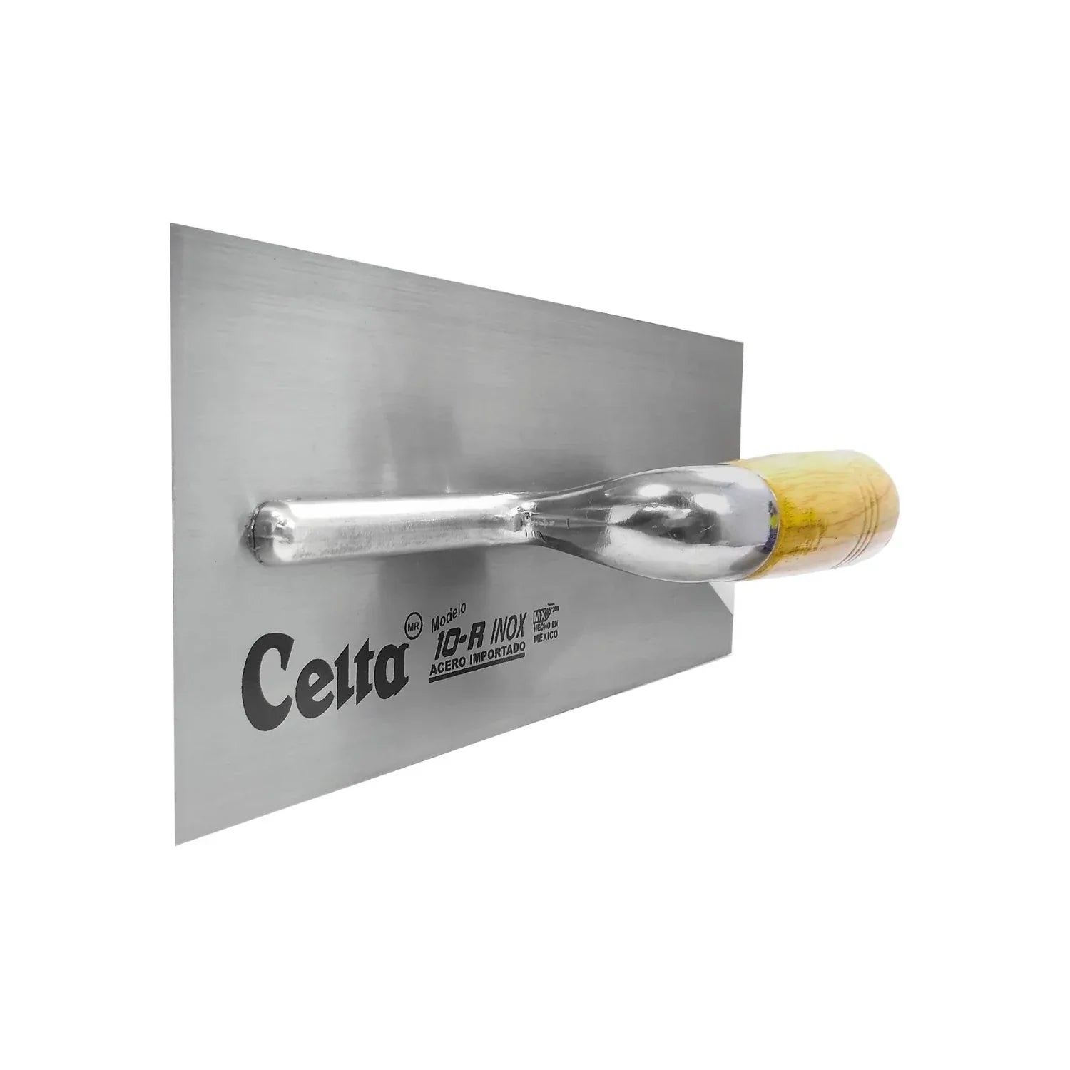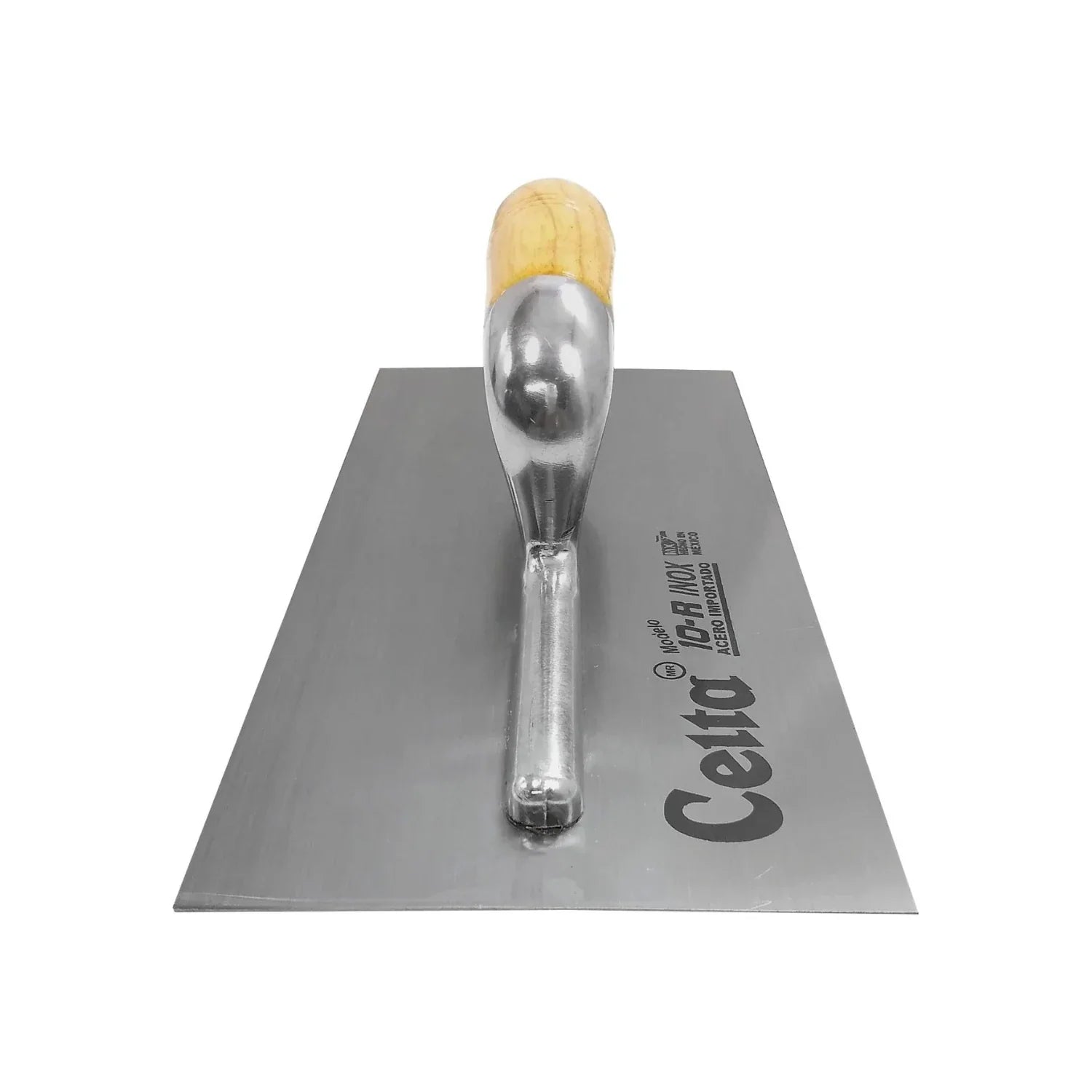 Llana lisa profesional Celta 88-INOX con hoja de acero inoxidable al alto cromo, perfectamente pulida y balanceada. Mango de madera barnizada tipo mueble y manija de aluminio pulido tipo espejo. Ideal para acabados finos, aplicación de pasta y alisado de superficies. Uso profesional en albañilería y decoración.