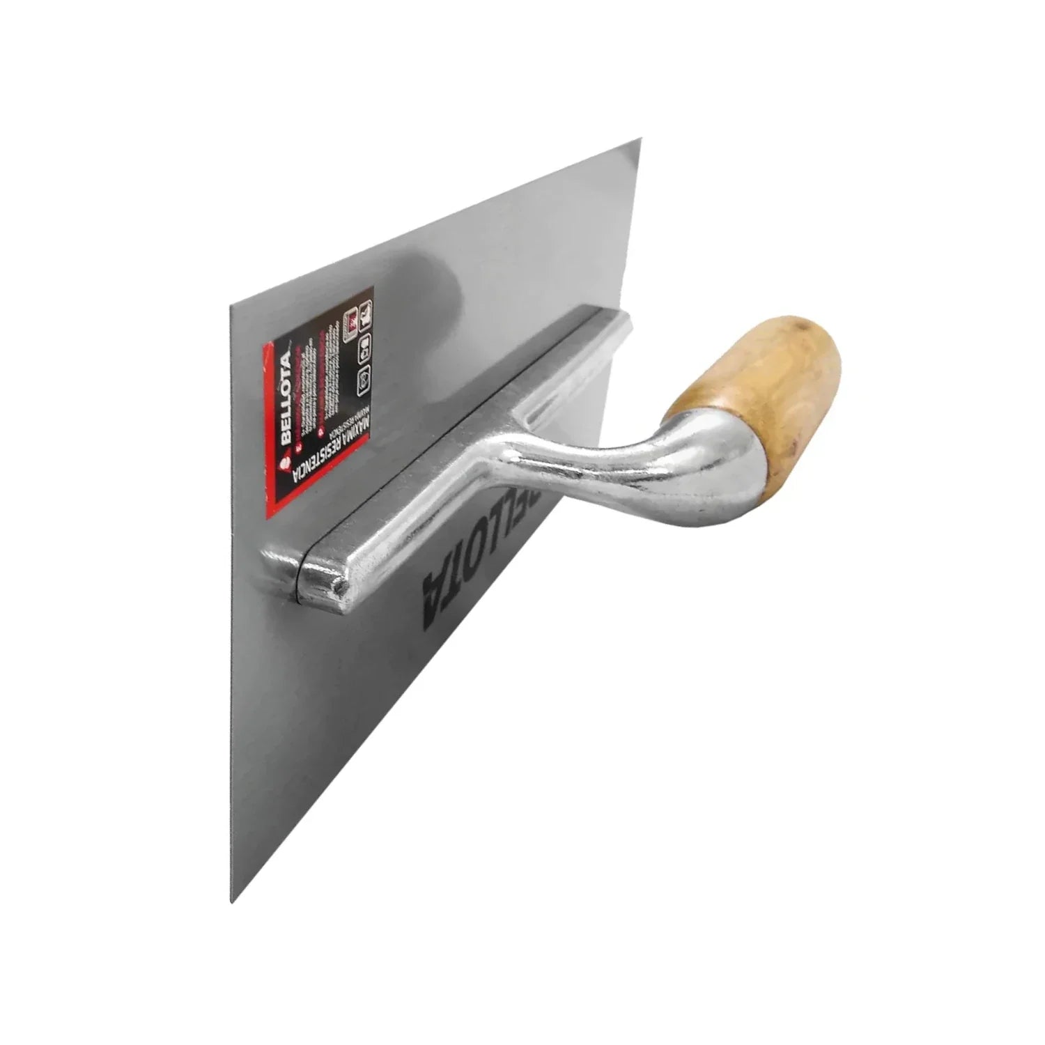 Llana lisa Bellota 75864 con hoja de acero especial tratada térmicamente y mango de madera barnizada. Superficie completamente plana para acabados finos, aplicación de pastas y alisado de mezcla. Uso profesional en albañilería y colocación de cerámica.