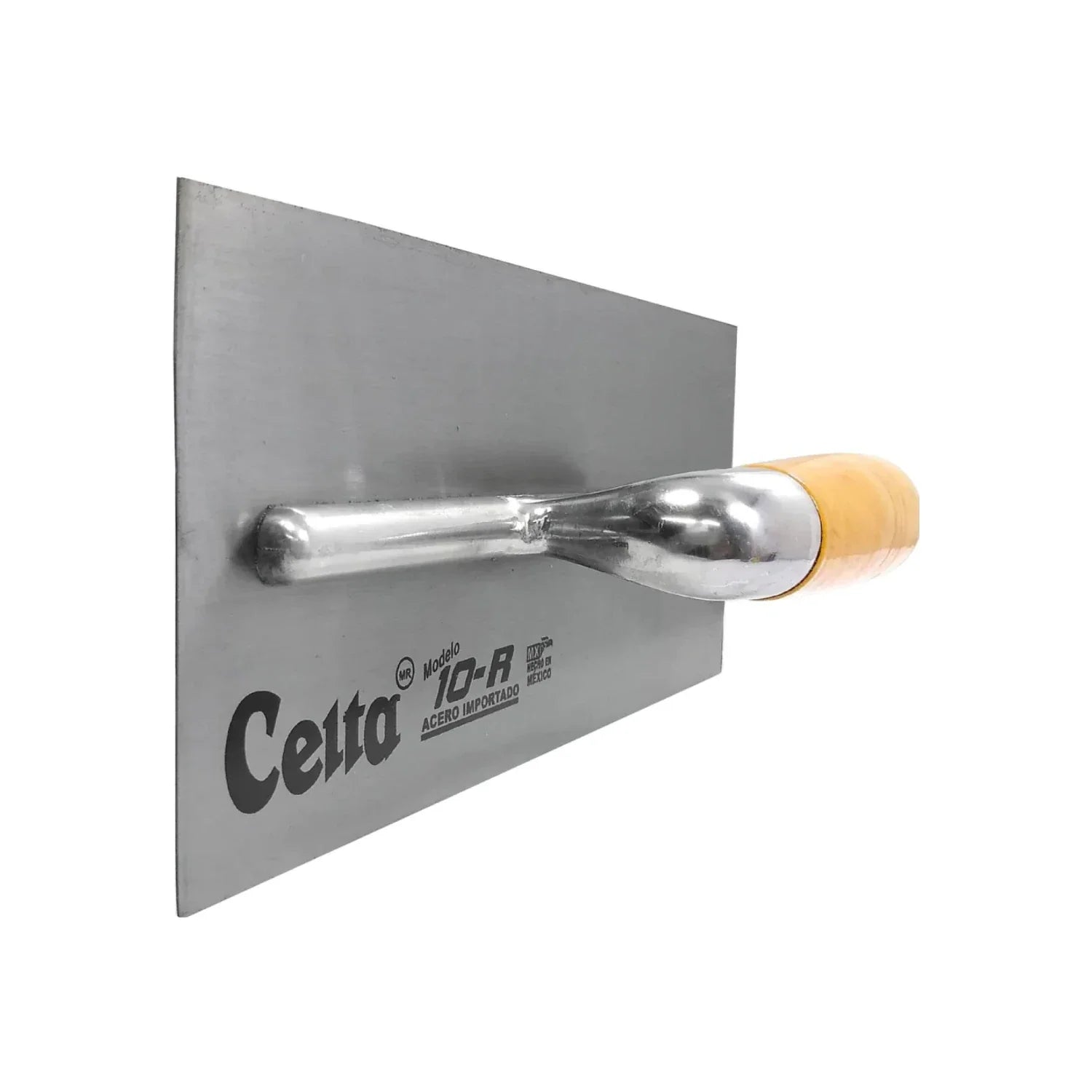 Llana lisa profesional Celta 10-R con hoja rectangular de acero templado, laqueada para evitar oxidación. Mango de madera barnizada tipo mueble y manija de aluminio pulido tipo espejo. Ideal para aplicación de pastas, estuco y alisado de superficies. Uso profesional en acabados finos.