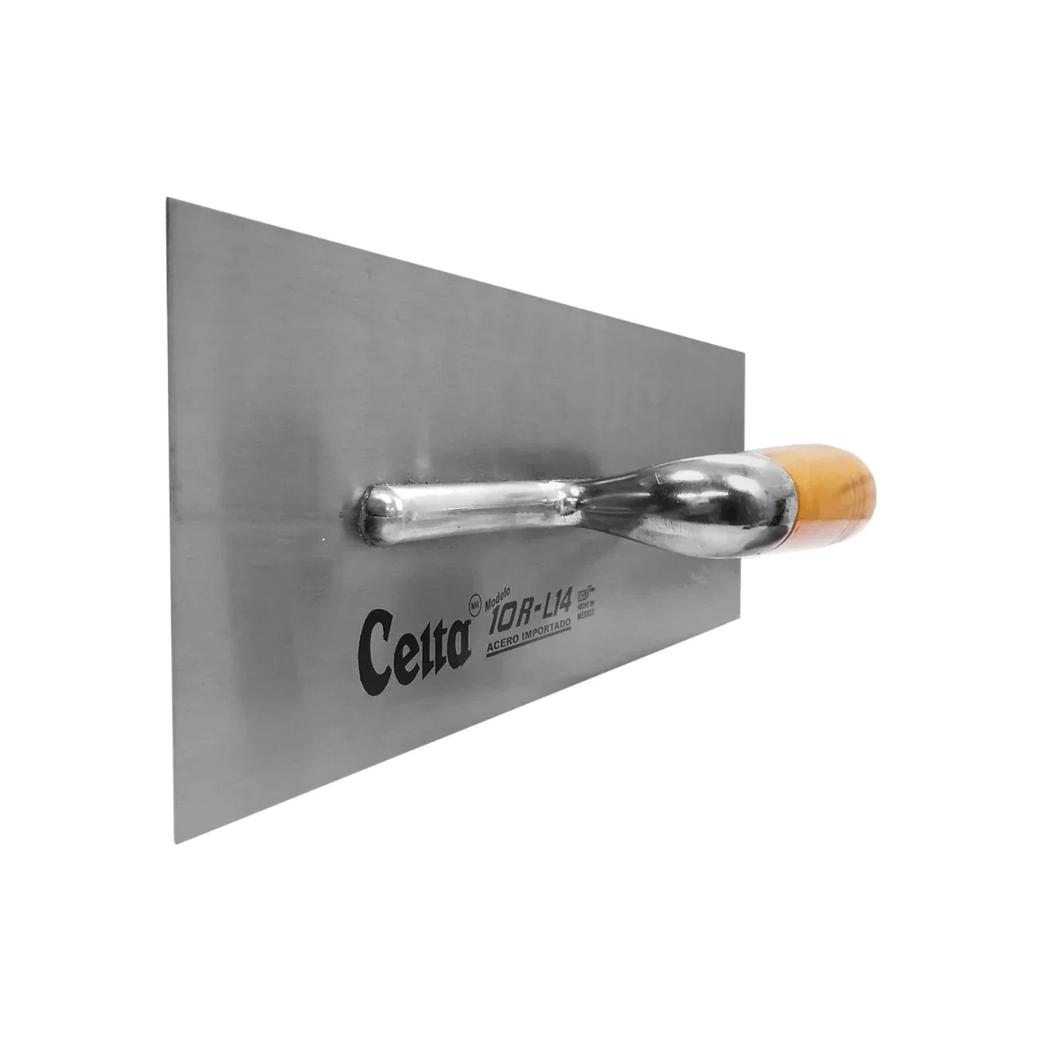 Llana lisa profesional Celta 10RL-14 con hoja rectangular de acero templado al alto carbón, pulida y barnizada para evitar oxidación. Mango de madera estufada tipo mueble y manija de aluminio pulido. Ideal para aplicación de pastas, estuco y alisado de superficies amplias. Uso profesional en acabados finos.