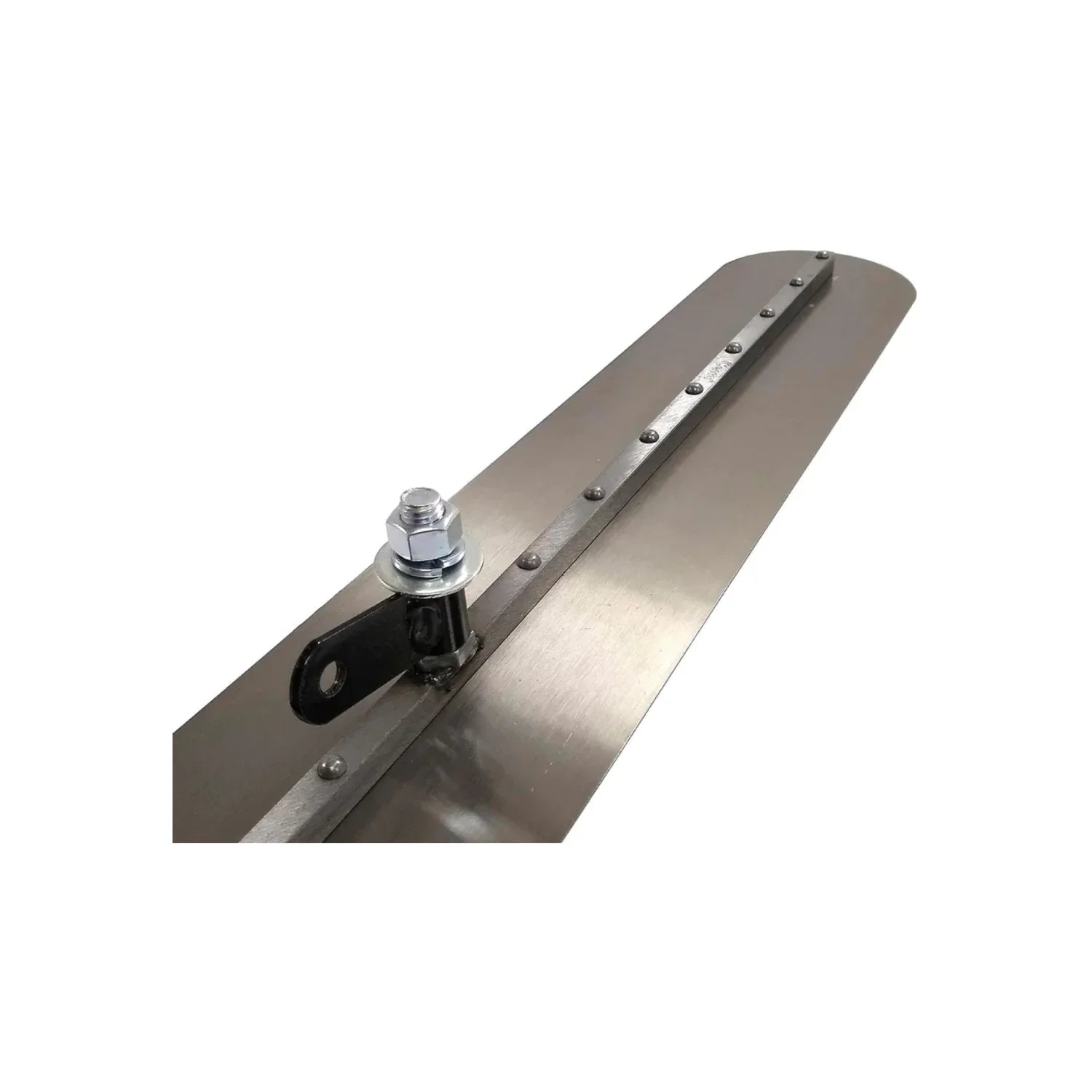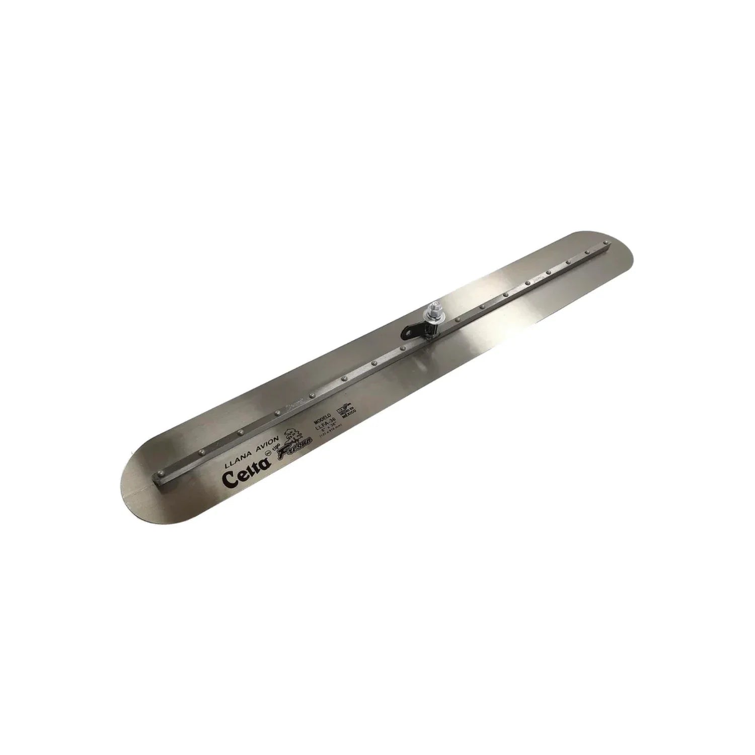 Llana tipo avión Celta LLFA-A36 sin mango, fabricada en acero al alto carbón con solera de alto calibre. Hoja rectangular de 5"x36" pulida y barnizada. Unión reforzada con 16 remaches metálicos. Compatible con bastón telescópico o adaptador roscado. Ideal para alisado de pisos y muros en obra profesional.