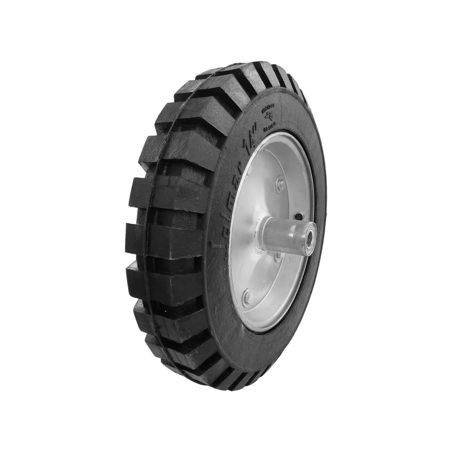Llanta maciza Jolmar B043 de 14", fabricada en caucho sólido antipinchazos. Rodada lisa con rin metálico galvanizado. No requiere inflado ni cámara. Ideal para uso continuo en obra, jardinería o carga pesada. Compatible con carretillas estándar de eje 5/8".