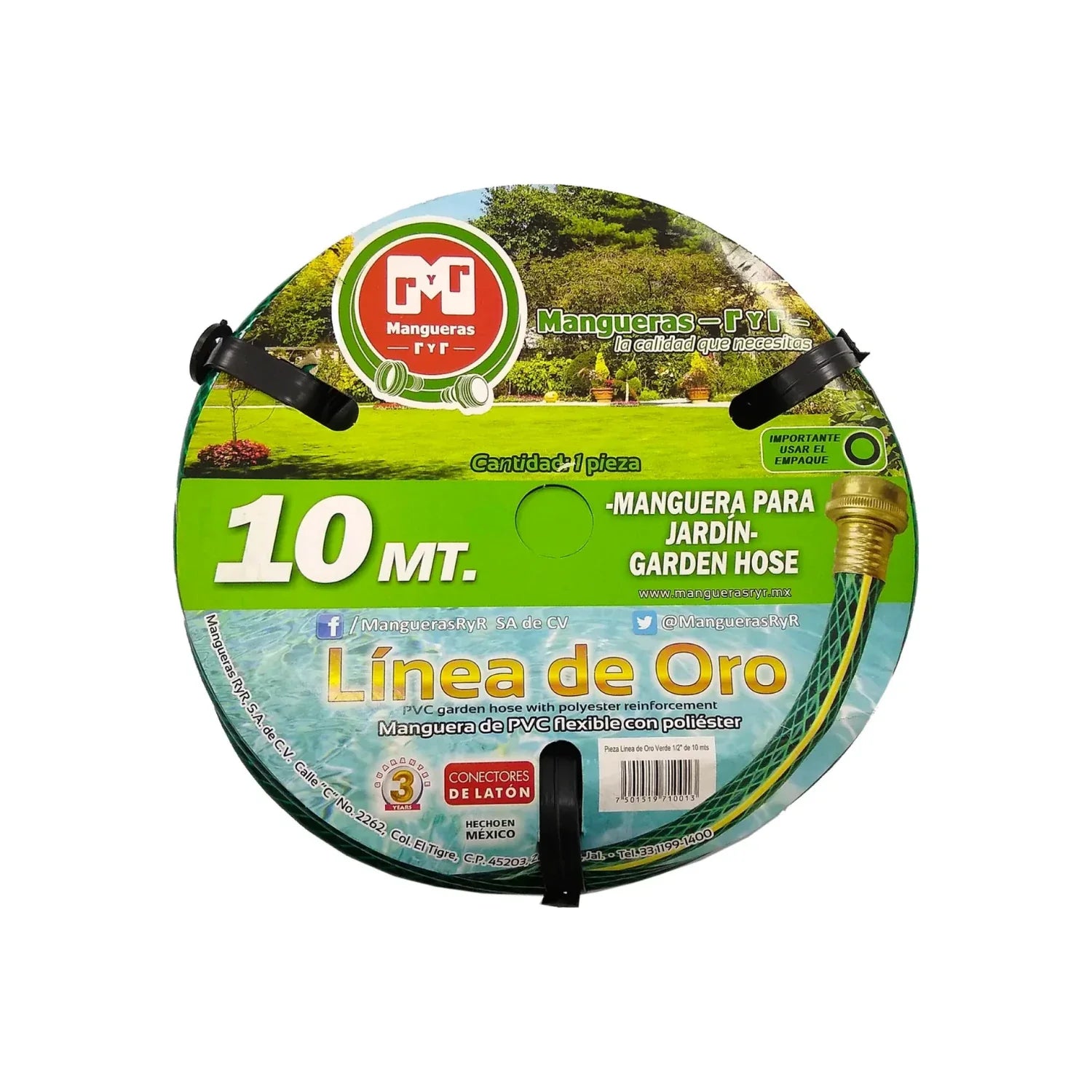 Manguera tramada Ryr J584 Línea de Oro, color verde, diámetro de 1/2", en rollo de 10 m. Fabricada en PVC flexible con refuerzo de hilo poliéster. Ideal para jardinería y riego doméstico