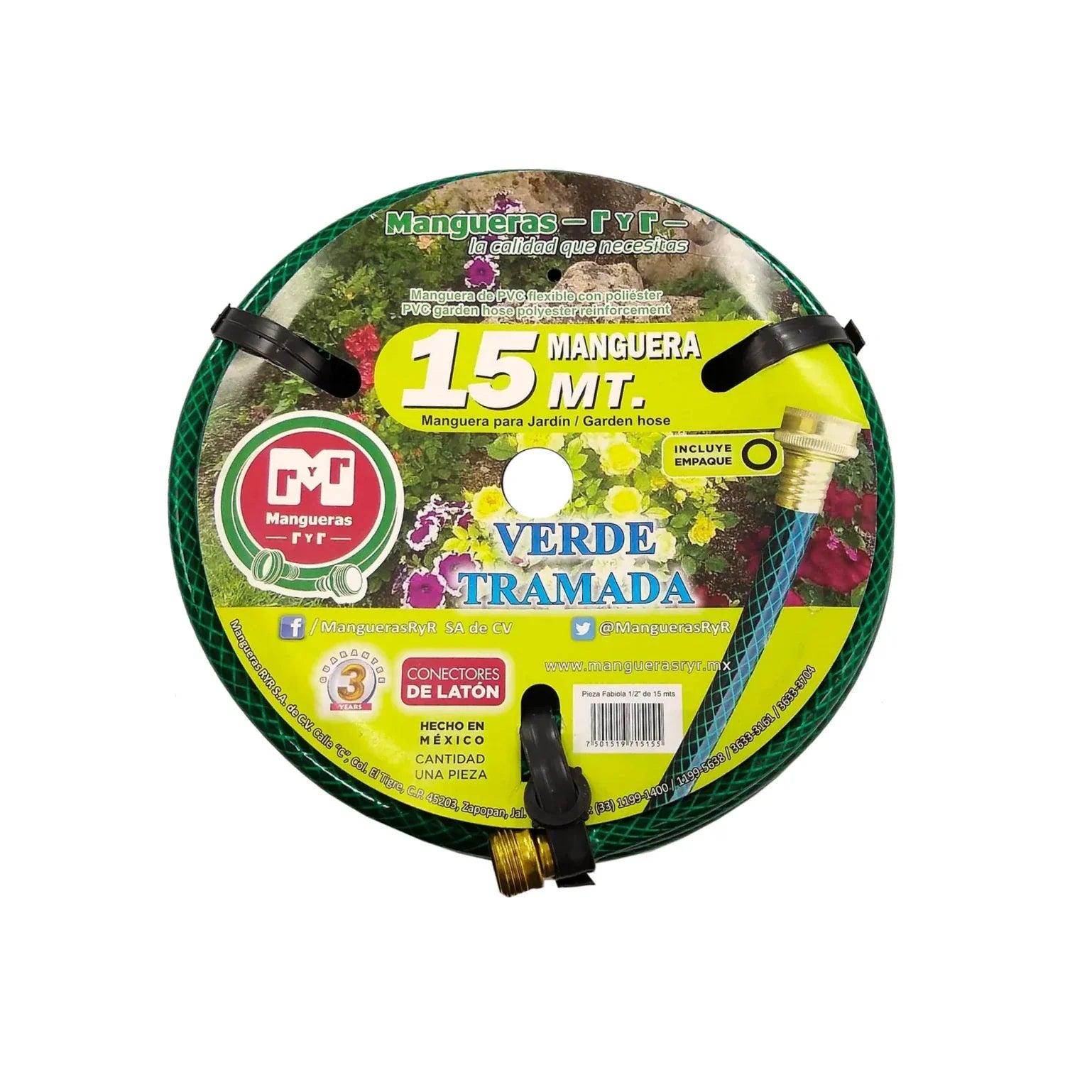 Manguera Ryr Fabiola J525 tramada, color verde, diámetro de 1/2", rollo de 15 m. Fabricada en PVC con refuerzo de hilo poliéster para mayor resistencia. Incluye conectores de latón en ambos extremos. Ideal para jardinería y riego doméstico.