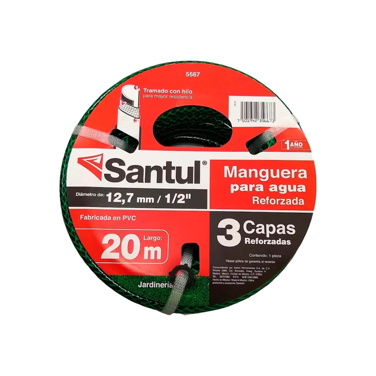 Manguera Santul 5667 reforzada tricapa, color verde, diámetro de 1/2", longitud de 20 m. Fabricada en PVC con tramado de hilo nylon para mayor resistencia. Con conectores plásticos. Ideal para jardinería y riego doméstico