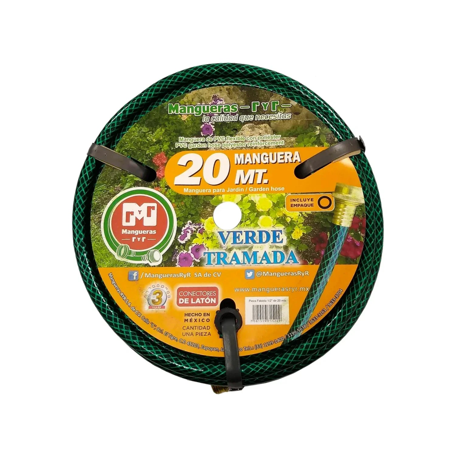 Manguera Ryr Fabiola J526 tramada, color verde, diámetro de 1/2", rollo de 20 m. Fabricada en PVC flexible con refuerzo de hilo poliéster para mayor resistencia. Ideal para jardinería, riego doméstico y uso ferretero. Con conectores metálicos de latón.