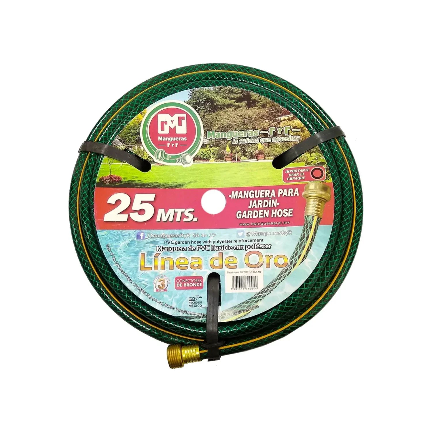 Manguera Ryr Línea de Oro J587 tramada, color verde con franjas doradas, diámetro de 1/2", rollo de 25 m. Fabricada en PVC flexible con refuerzo de hilo poliéster. Alta resistencia a torceduras y presión atmosférica. Con conectores metálicos de latón.