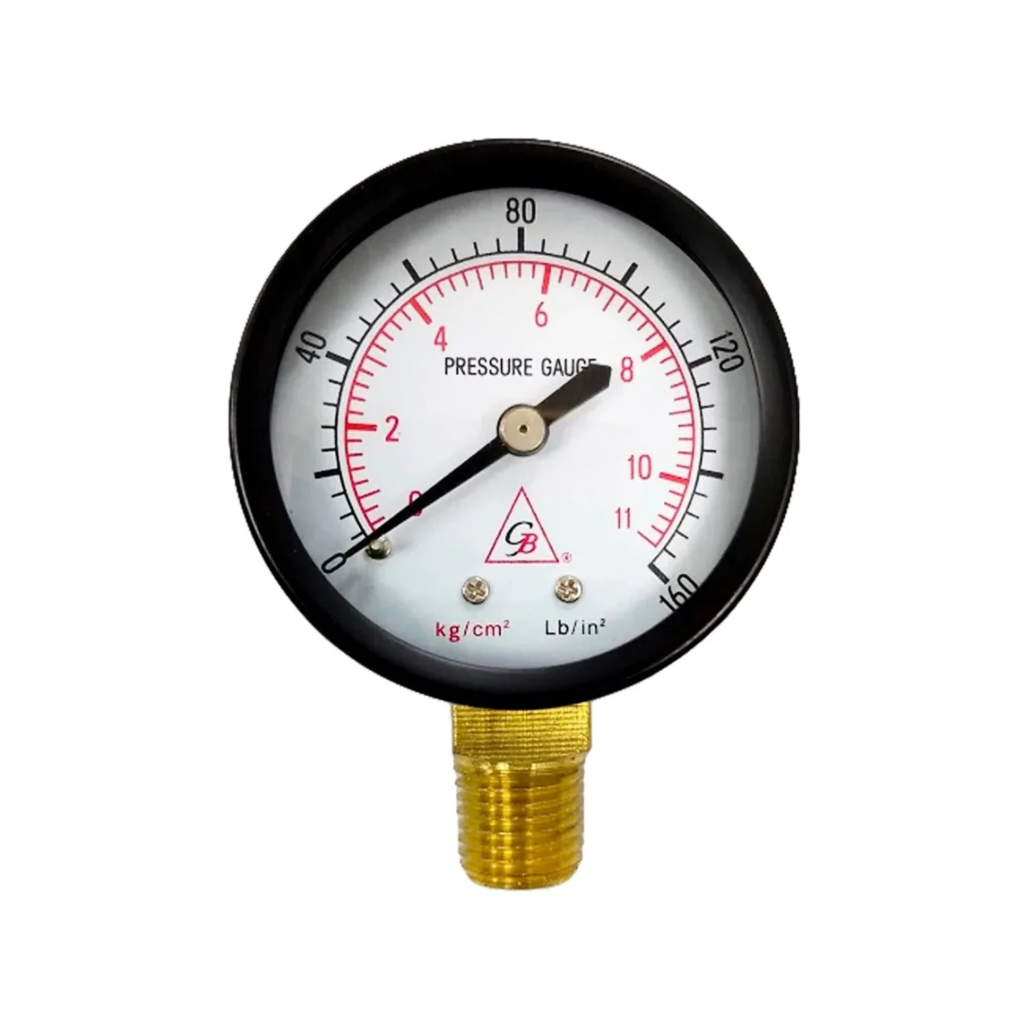 Manómetro de presión de 0 a 160 psi, ideal para sistemas de aire, agua, gas o hidráulicos. Conexión NPT de 1/4", escala dual en psi y kg/cm². Otorga precisión y durabilidad.