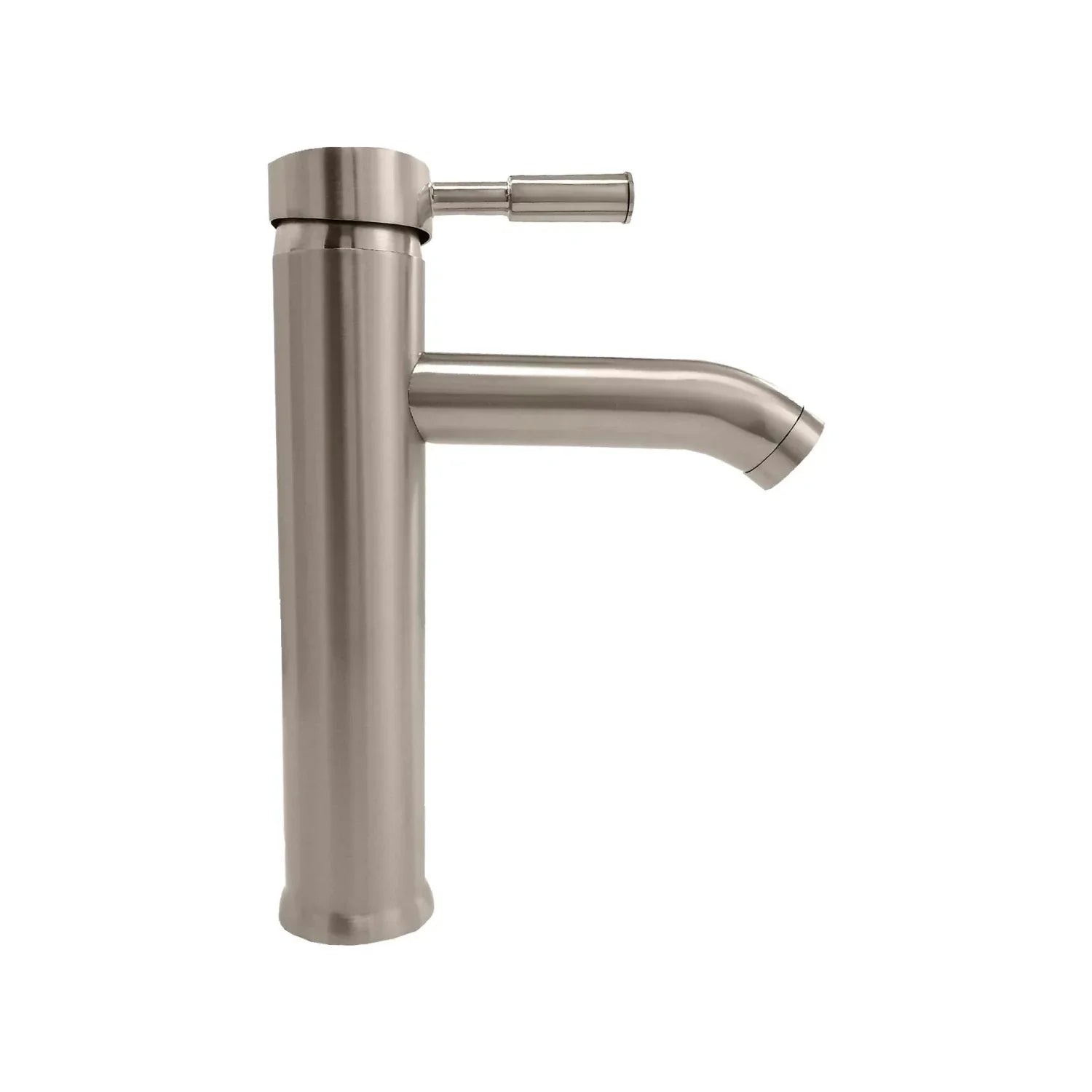 Monomando tubular Fidic F9805BN para fregadero de 25 cm de alto, fabricado en acero inoxidable con acabado satinado. Cuello recto, cartucho cerámico de larga duración. Diseñada para cocinas modernas que requieren estética, funcionalidad y resistencia.