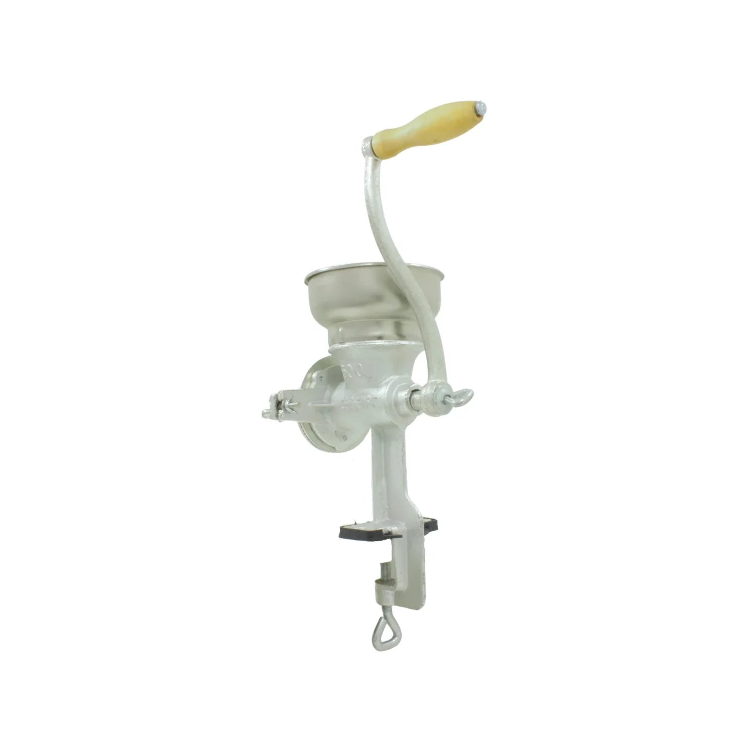 Molino manual Cadena para granos secos como maíz, café y cacao, fabricado en hierro fundido con acabado estañado, ideal para uso doméstico o comercial ligero que requiere molienda uniforme, resistencia prolongada y fácil ajuste de grosor.