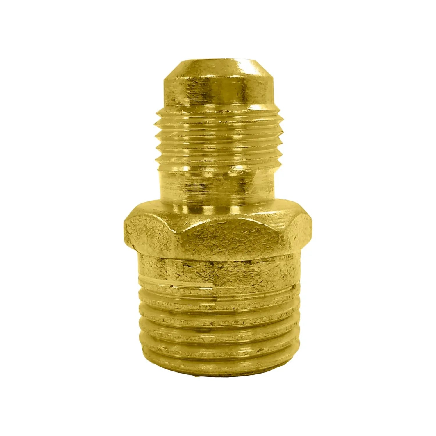 Niple terminal latonado 3/8" x 1/2" para unir rosca NPT a manguera o flare. Ideal para instalaciones de gas, agua o refrigeración.