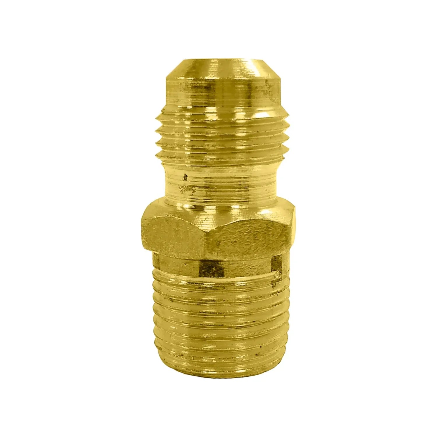 Niple terminal latonado 3/8" x 3/8" para unir rosca NPT a flare. Ideal para instalaciones de gas LP o natural sin necesidad de soldadura.