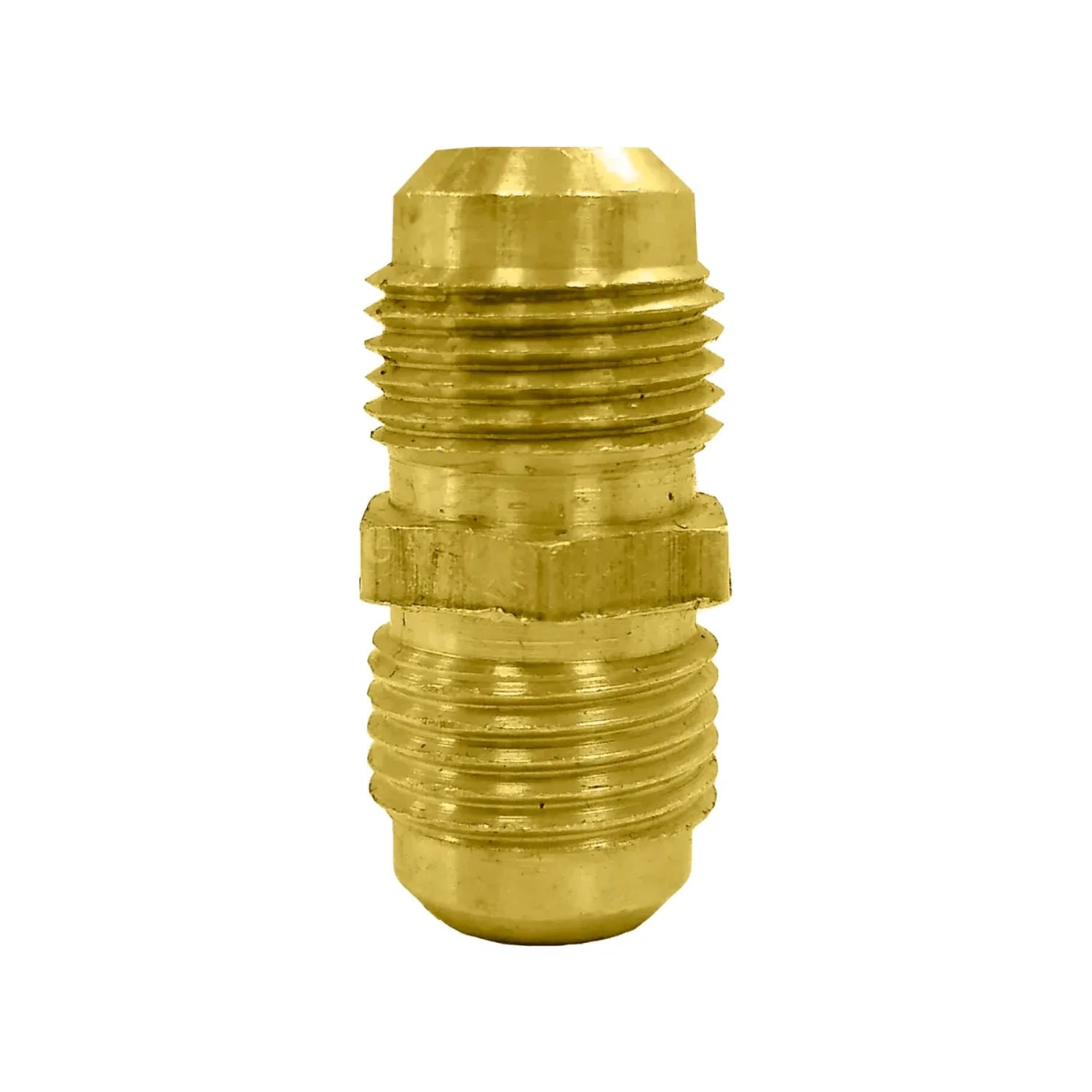 Niple unión latonado 3/8" x 3/8" para unir dos roscas Flare o NPT del mismo diámetro. Ideal para instalaciones de gas LP, natural o refrigeración.