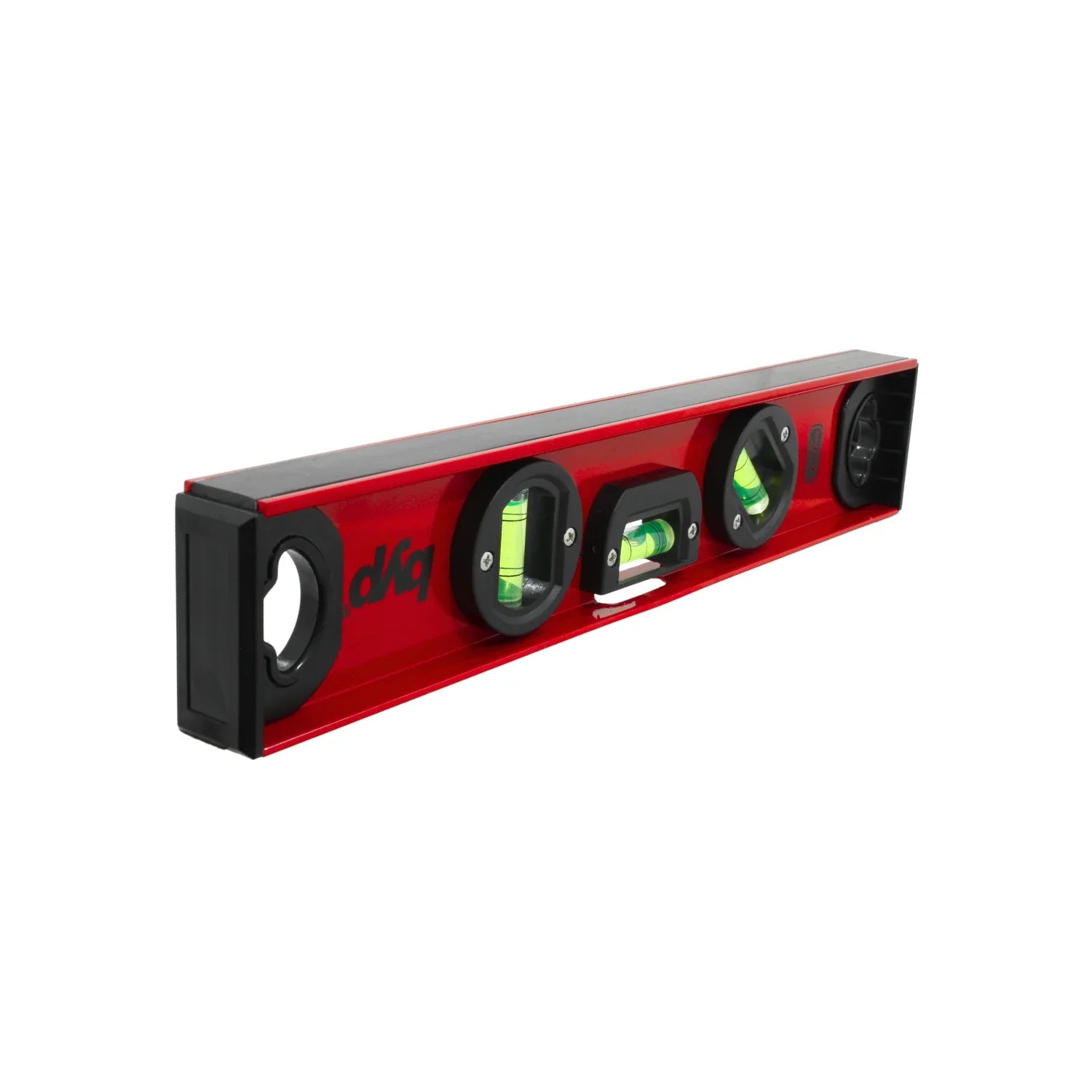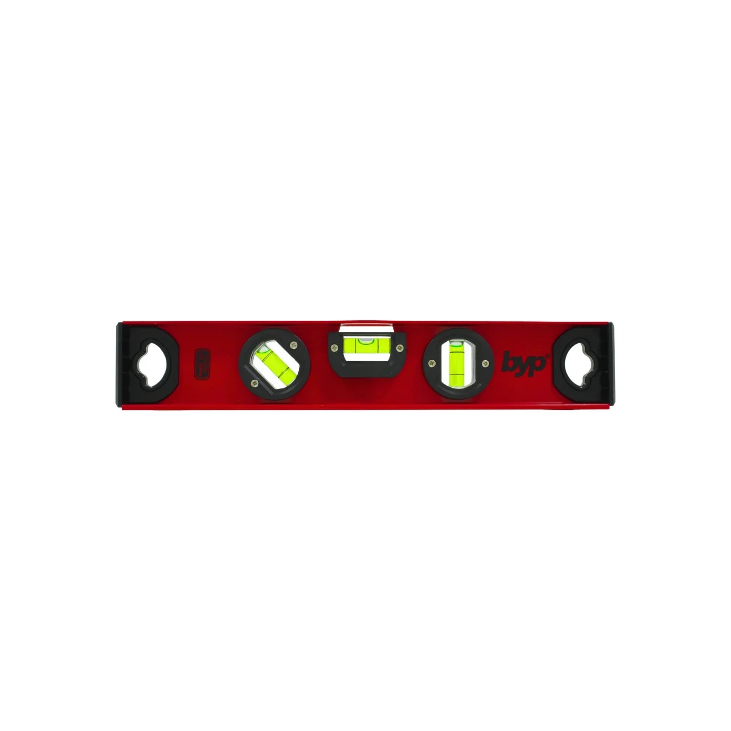 Nivel magnético Byp NIVPM12 de 12" en aluminio, con tres gotas (45°, 90°, 180°) y banda magnética lateral. Ideal para trabajos de precisión en carpintería, instalación y obra.