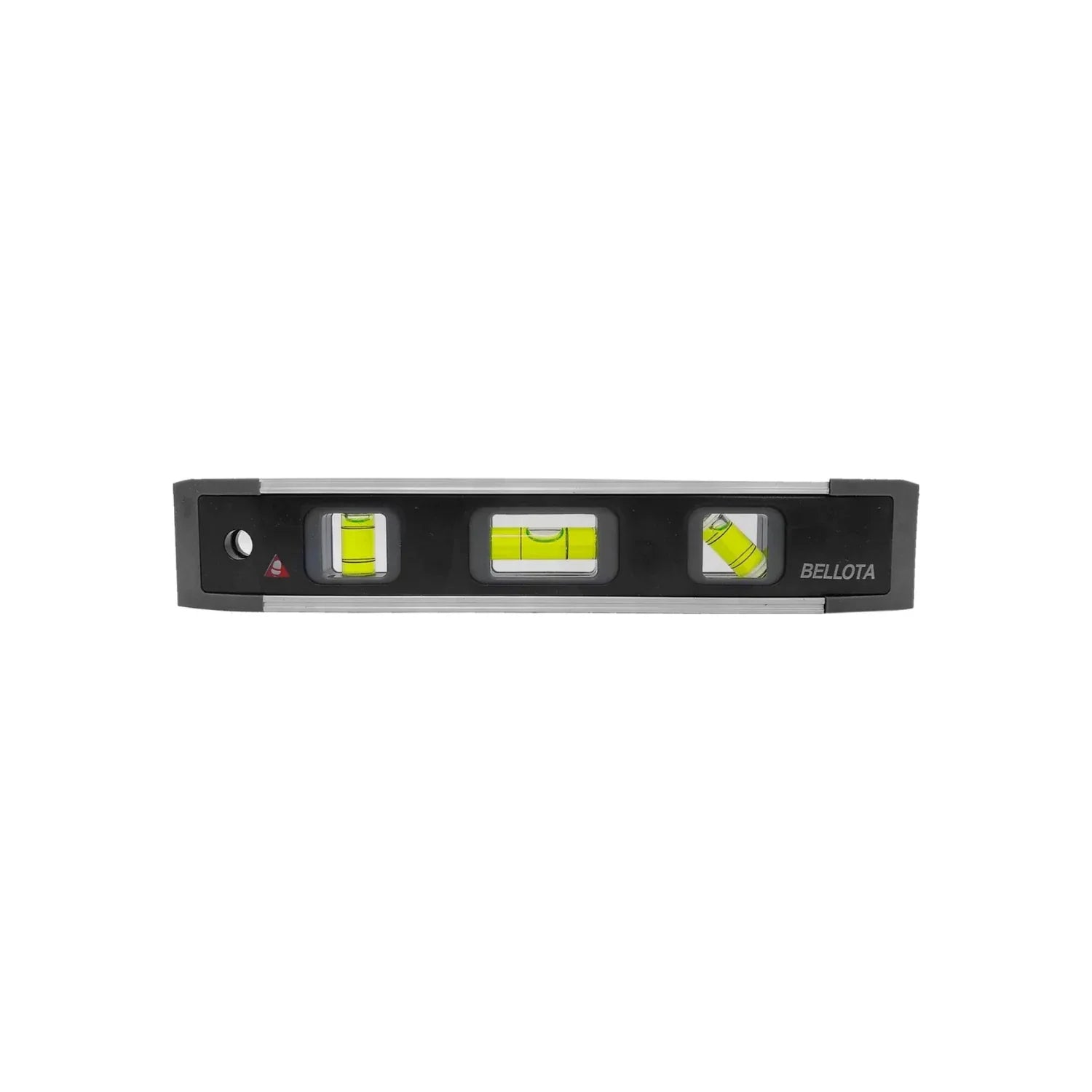 Nivel torpedo Bellota 750109A9 de 9" con cuerpo ABS reforzado en aluminio, base magnética y tres gotas calibradas. Compacto, preciso y resistente para instalaciones, carpintería y trabajos en espacios reducidos.