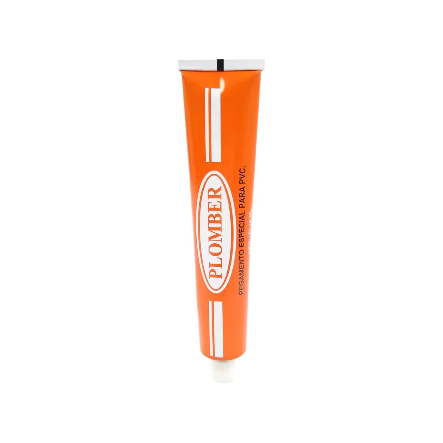 Pegamento naranja para PVC Plomber PVC-TUB60 en presentación de 60 ml, diseñado para unir tuberías y conexiones en sistemas sanitarios, hidráulicos y eléctricos. Su fórmula de secado rápido y alta adherencia permite una instalación eficiente en condiciones húmedas o secas.