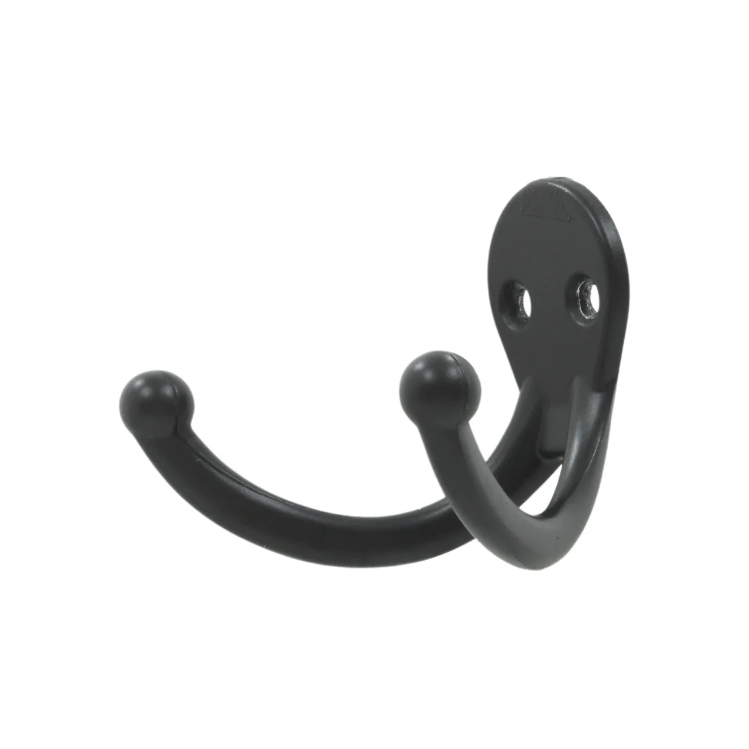 Gancho doble tipo perchero Handy Home 1828 en acabado negro, fabricado en zamac de alta resistencia. Ideal para colgar ropa, accesorios o herramientas ligeras en muros, puertas o mobiliario. Su diseño compacto y discreto se adapta a espacios residenciales y comerciales.