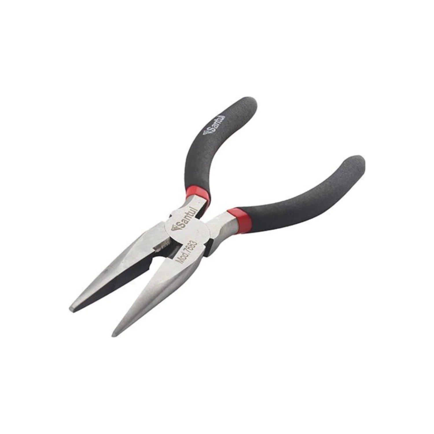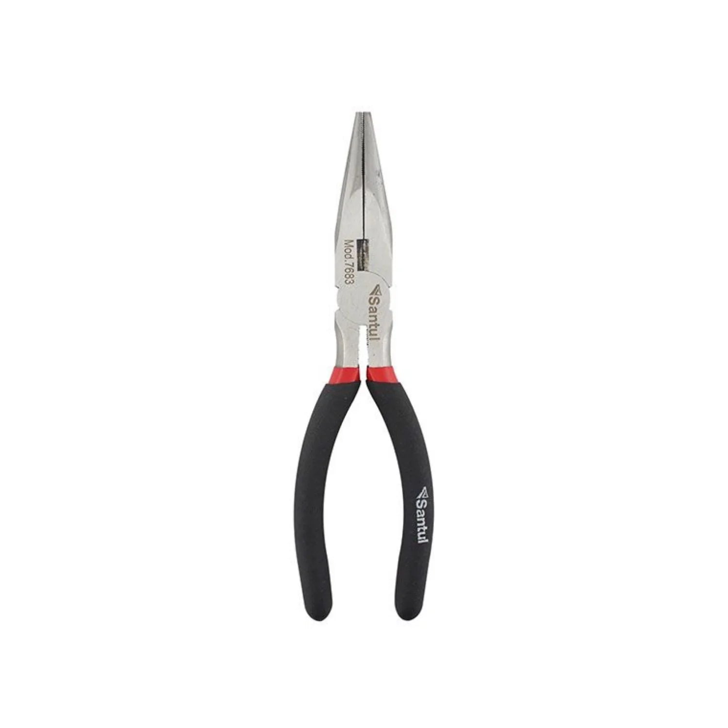 Pinza profesional Santul 7683 de 8 pulgadas con punta recta y corte lateral, diseñada para sujetar y cortar alambres con precisión. Fabricada en acero al medio carbono con mordazas estriadas y mango ergonómico de vinil, ofrece máxima dureza y control en trabajos eléctricos, electrónicos y de mantenimiento.