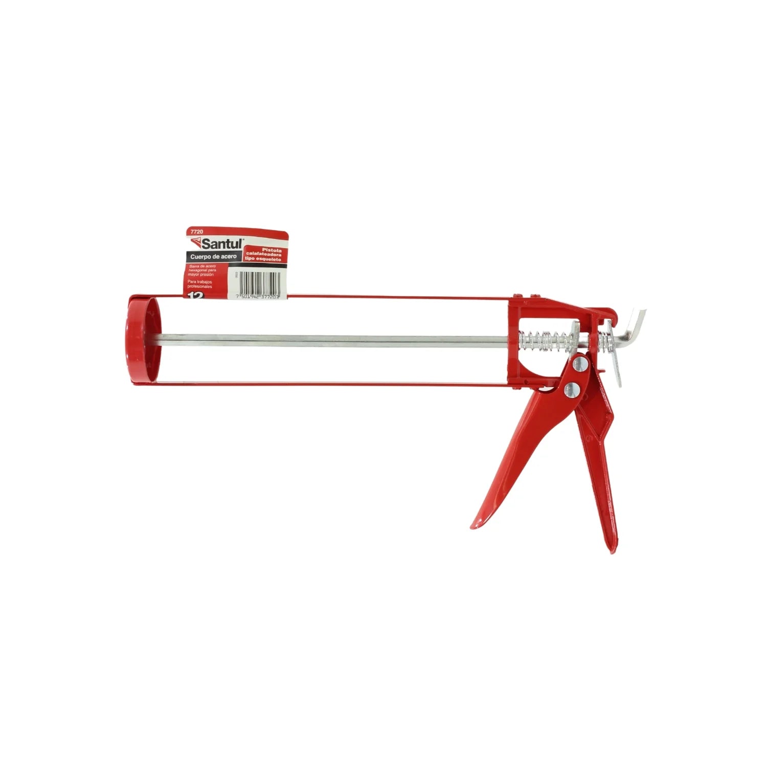 Pistola calafateadora Santul 7720 tipo esqueleto, diseñada para aplicar silicón en trabajos profesionales. Su cuerpo metálico con espiga hexagonal y barra lisa ofrece mayor presión y control. El mango tipo “T” de aluminio inyectado mejora la ergonomía y resistencia. Compatible con cartuchos estándar, ideal para sellado de juntas, acabados y mantenimiento.