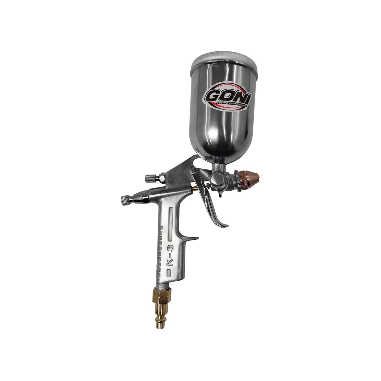Pistola mini de gravedad Goni 314 tipo HVLP con vaso giratorio de 200 ml, diseñada para retoques finos, pruebas de color y acabados detallados. Su boquilla de 1.0 mm y abanico de 5 cm permiten aplicar esmaltes, barnices y lacas acrílicas con precisión. Ideal para repintado automotriz, ebanistería y artes gráficas.