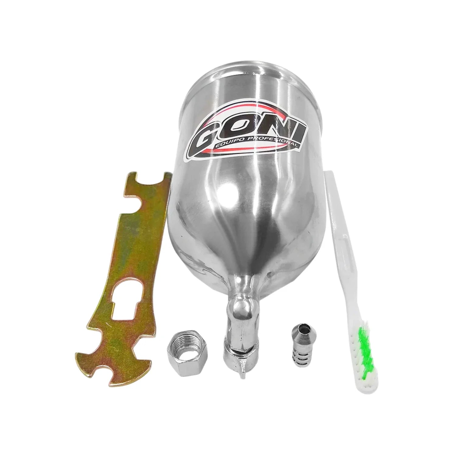 Pistola de gravedad Goni 352 tipo HVLP con vaso giratorio de aluminio de 400 ml, diseñada para aplicaciones en cualquier posición. Su boquilla de 1.5 mm y controles independientes de material, abanico y aire permiten un patrón uniforme y eficiente. Ideal para repintado automotriz, carpintería y acabados profesionales.