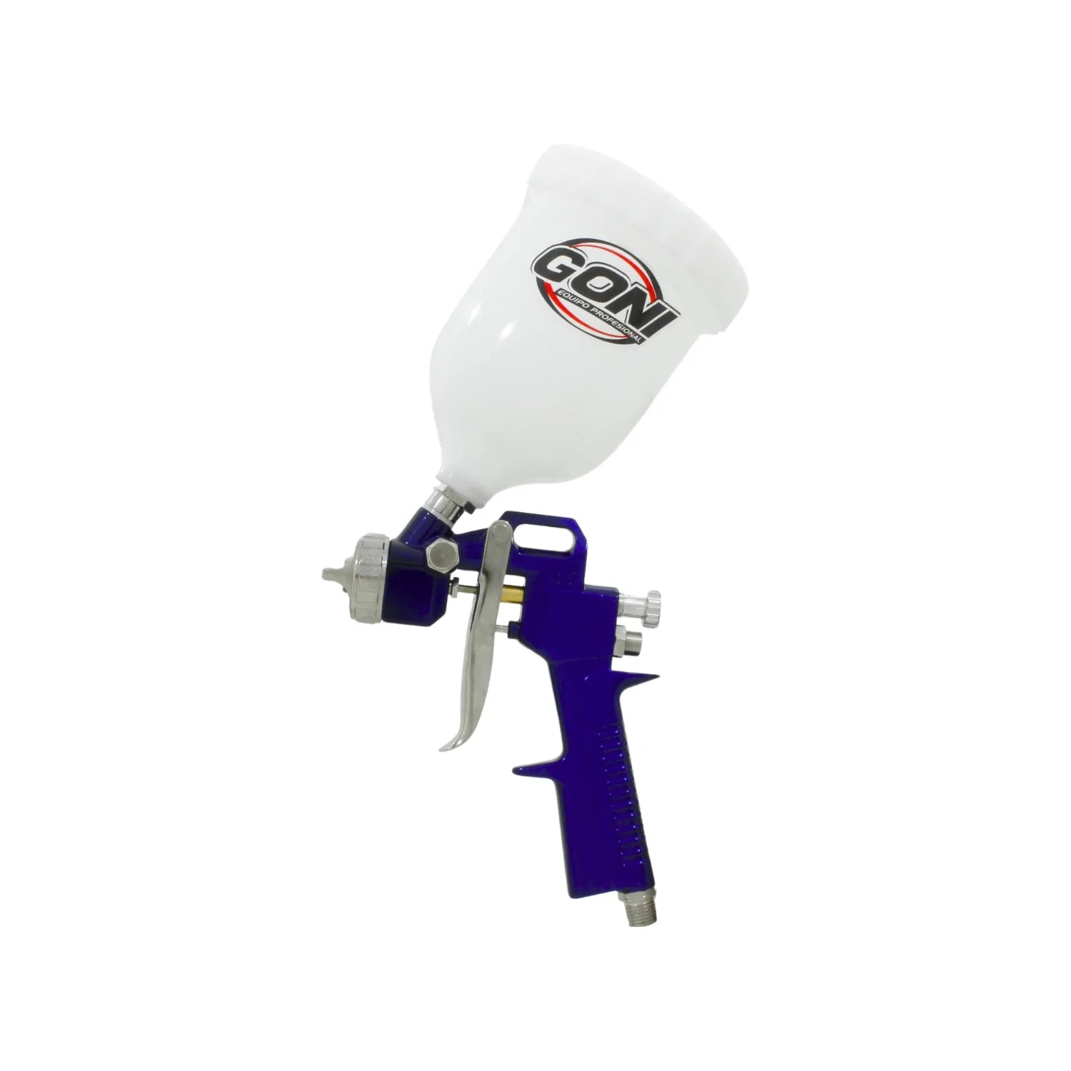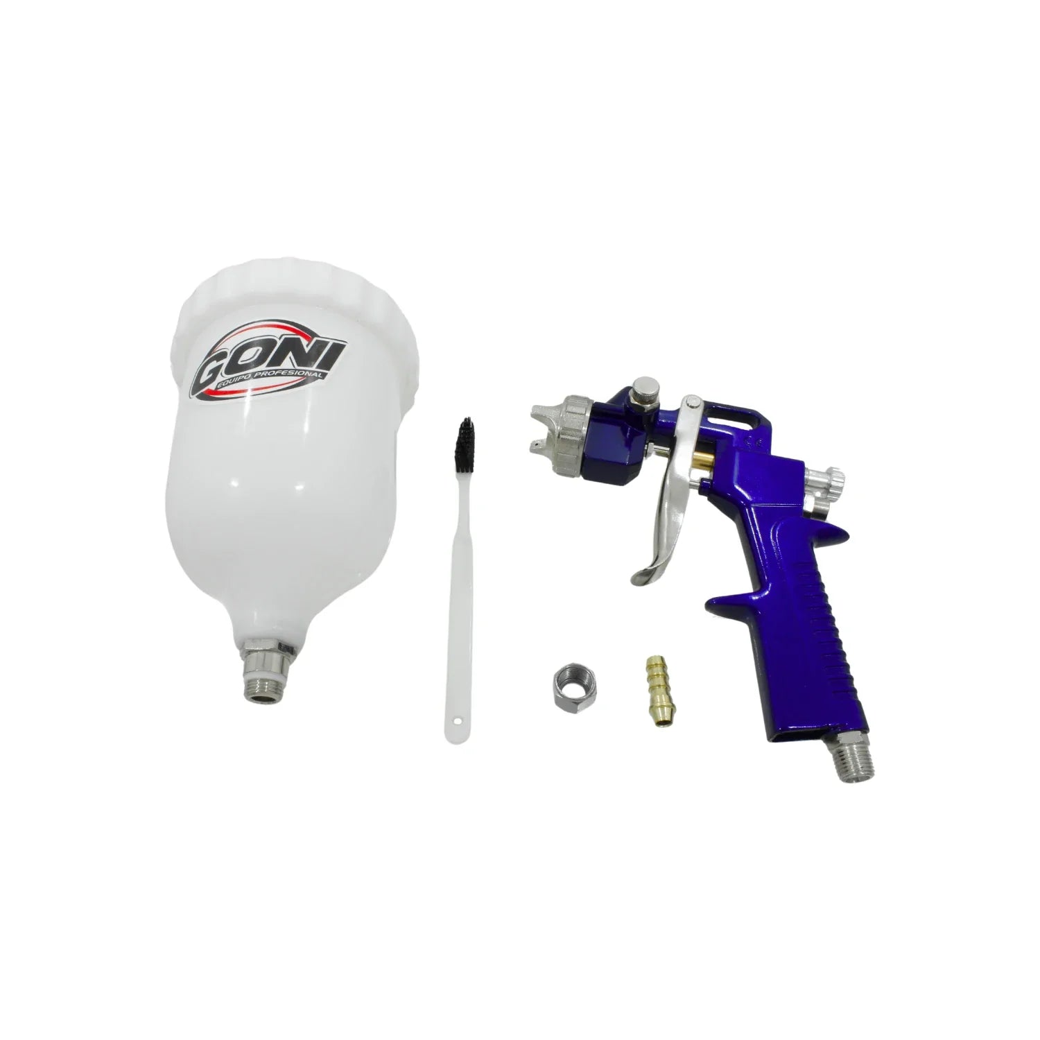 Pistola híbrida Goni 33014 de gravedad con vaso de 600 ml y boquilla de 1.8 mm, diseñada para aplicar materiales de viscosidad media como esmaltes, lacas, poliuretanos y recubrimientos decorativos. Su sistema de flujo mixto (continuo y no continuo) permite acabados uniformes con alta transferencia y mínimo desperdicio. Ideal para hojalatería, carpintería y pintura decorativa.