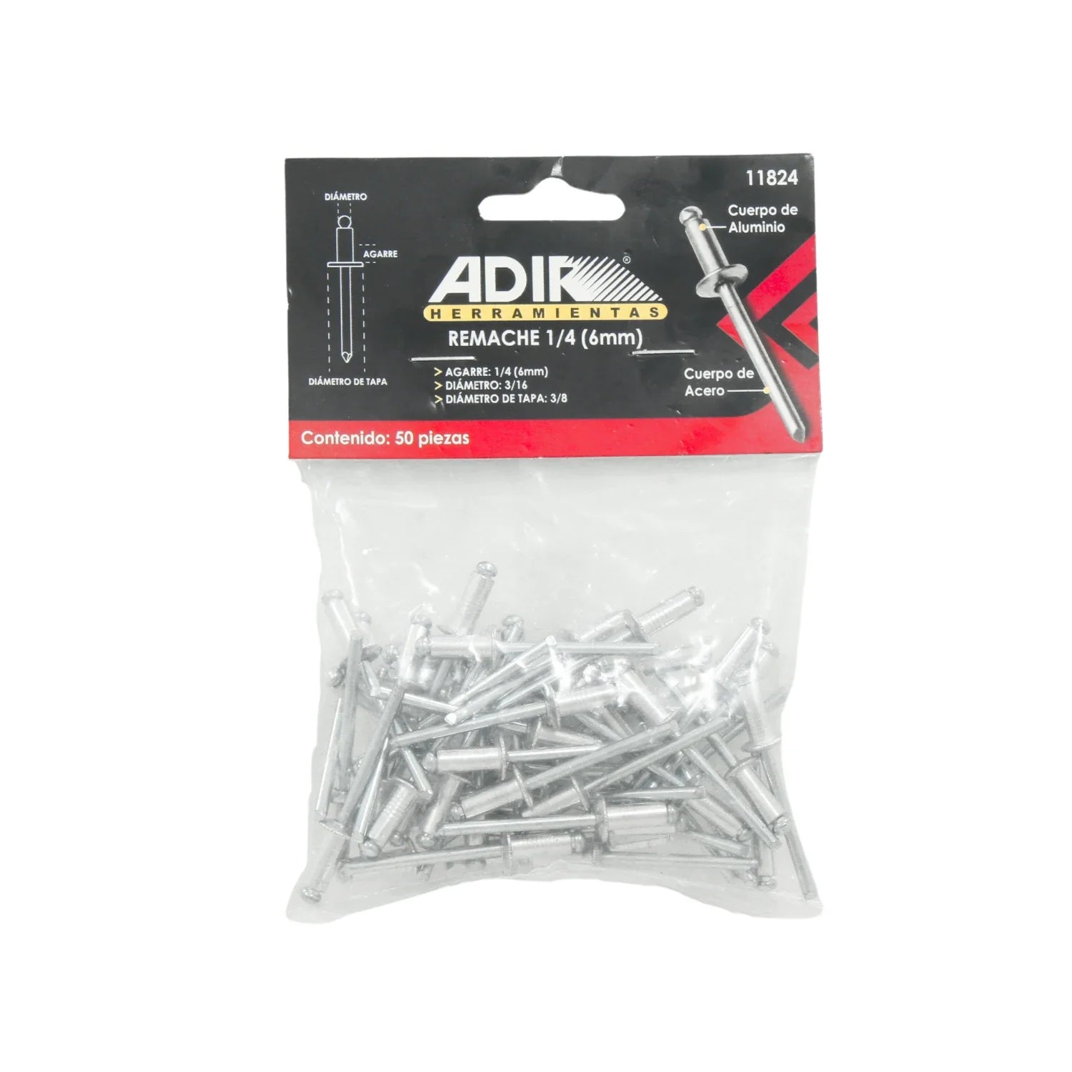 Remache 3/16"x3/8"x1/4" (6 mm) Adir 11824, juego de 50 piezas fabricadas en metal resistente para uniones firmes y duraderas. Ideal para trabajos en metal, plástico y otros materiales, tanto en aplicaciones industriales como domésticas. Compatible con herramientas estándar para remachado, asegurando un montaje seguro y eficiente.
