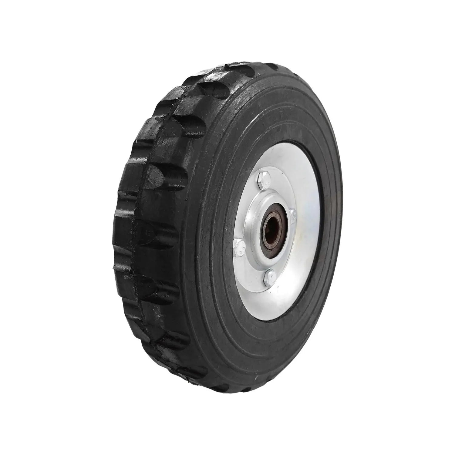 La rueda Huajucar de 8 pulgadas con doble balero está diseñada para diablitos de carga pesada Fabricada con llanta de hule sólido resistente a pinchaduras y rin de lámina tipo tractor, ofrece estabilidad y durabilidad en terrenos irregulares.