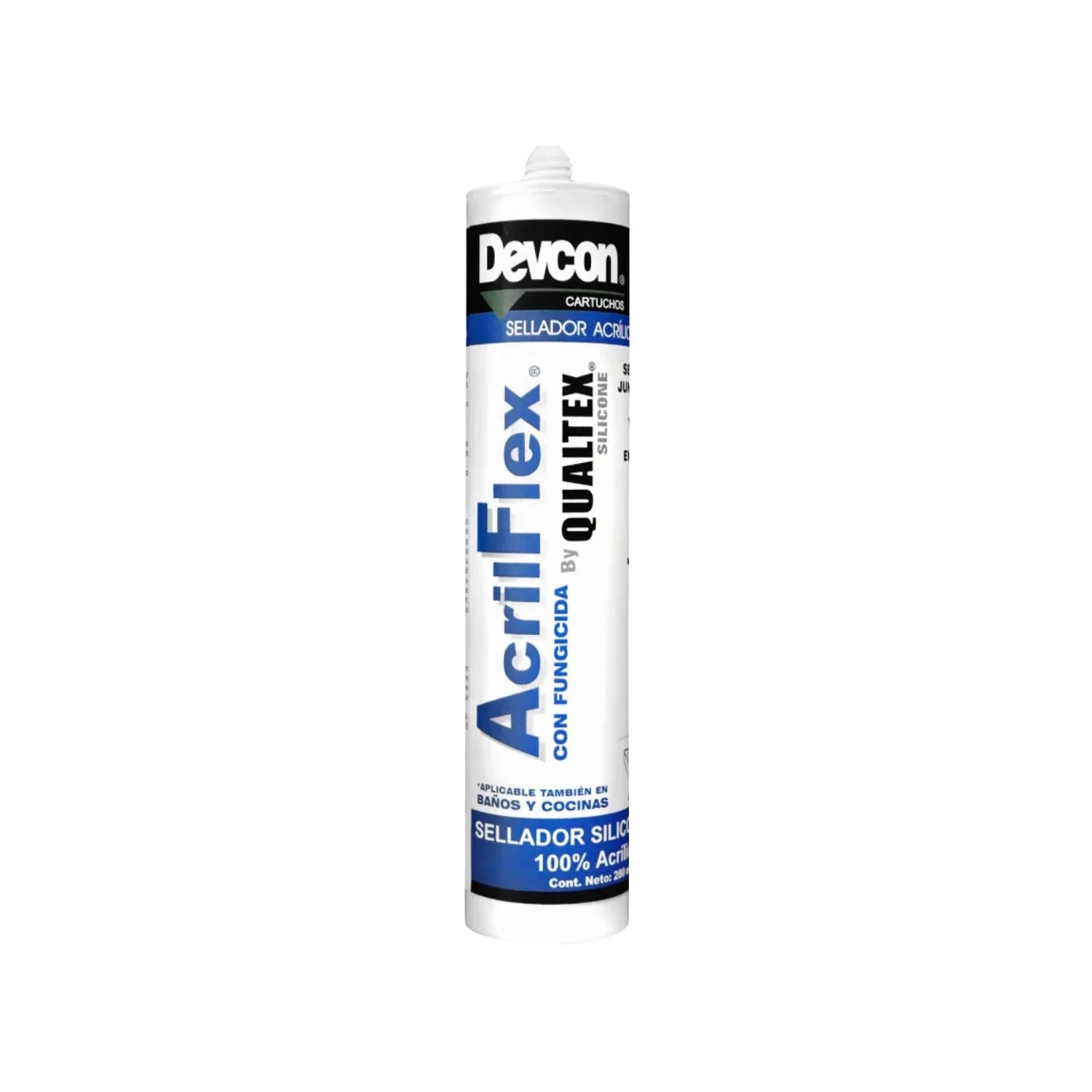 El silicón acrílico Devcon C-QAB AcrilFlex de 280 ml está diseñado para sellar juntas en baños y cocinas, ofreciendo resistencia a la humedad y al moho. Su fórmula acrílica es flexible, fácil de aplicar, pintable y con excelente adherencia a materiales porosos y no porosos.