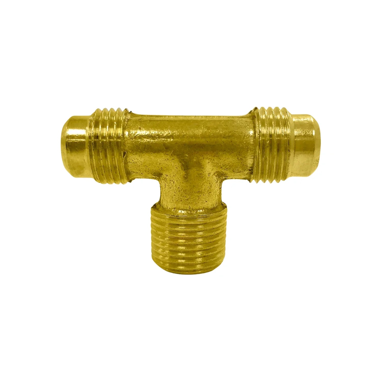 La Tee terminal centro de 3/8" (10 mm) está fabricada con latón de alta calidad, ofreciendo gran resistencia y durabilidad. Su diseño incluye dos roscas macho tipo flare y una salida central macho NPT, ideal para derivar el flujo de gas LP o natural en ángulo de 90°, manteniendo la hermeticidad de la instalación.